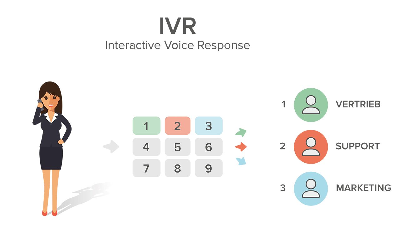 Mit IVR (Interactive Voice Response) entscheiden Kunden über ein interaktives Sprachmenü selbst, mit welcher Abteilung sie verbunden werden möchten. Dafür wird dem Kunden zunächst eine Ansage mit verschiedenen Auswahl-möglichkeiten bereitgestellt, z.B. „Wählen Sie die 1 für Vertrieb, die 2 für Support und die 3 für Marketing“.
