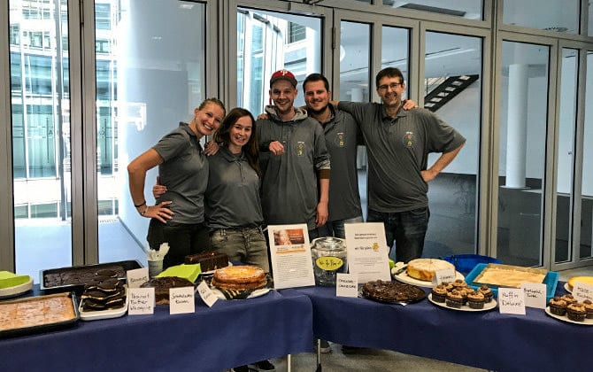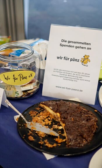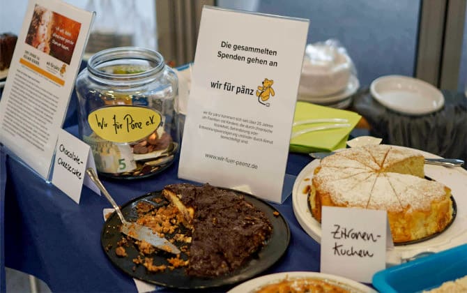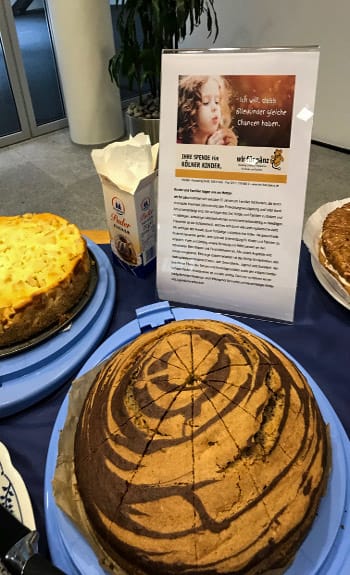 Der Kuchenverkauf fand im Eingangsbereich unseres Bürogebäudes der Lothringer Str. 56 statt und ist bei allen Firmen auf positive Resonanz gestoßen. Von den über 20 gebackenen Kuchen, darunter auch eine Bratapfeltorte, ein Double Chocolate Cheesecake und ein Zebrakuchen, blieb so gut wie nichts mehr übrig. Es war ein voller Erfolg und hat uns allen riesigen Spaß gemacht. Ganz nebenbei haben wir dann auch noch eine stattliche Summe von fast 500€ zusammenbekommen, die wir an wir für Pänz e.V. spenden. wir für Pänz kümmert sich seit über 25 Jahren um Familien und Kinder, die durch chronische Krankheit, Behinderung oder Entwicklungsverzögerung und/oder durch Armut benachteiligt sind.