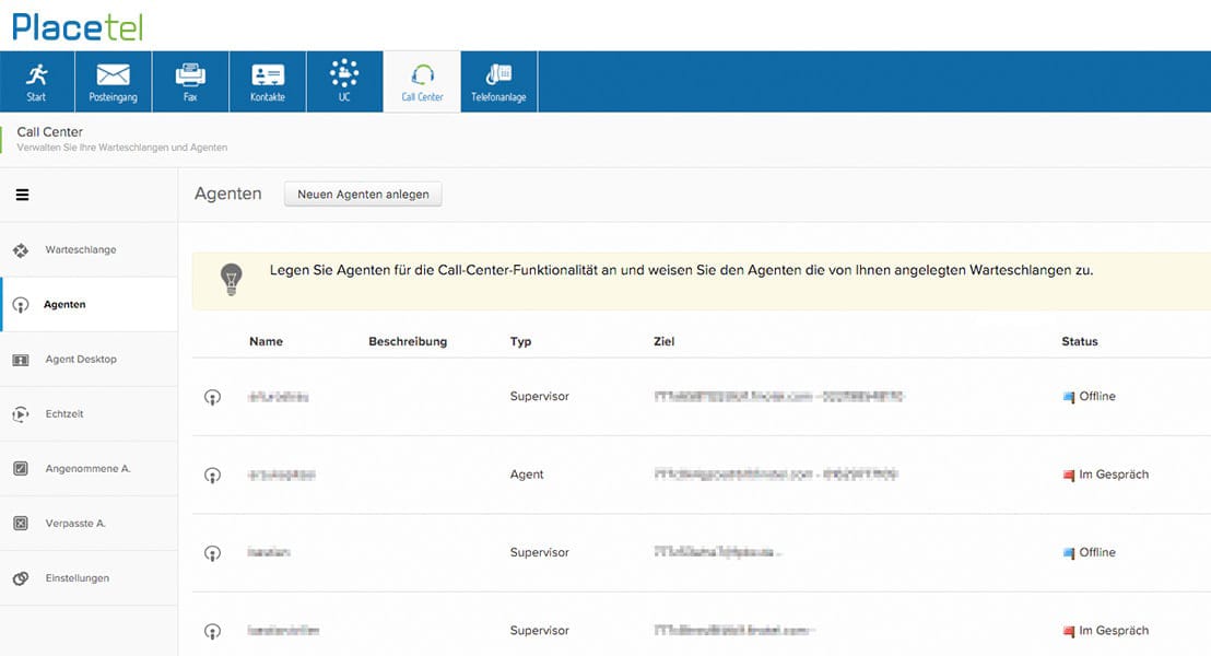 Das Placetel Contact Center ist der Bereich in der Placetel Telefonanlage, in dem Warteschlangen und Warteschleifen definiert und organisiert werden. In den Warteschlagen werden eingehende Anrufe gesammelt, bis ein freier Mitarbeiter den jeweiligen Anruf entgegennehmen kann. Warteschlagen können nach Themen, Produkten, Regionen, Sprachen, Zielgruppen etc. aufgeteilt werden. Die Mitarbeiter, die die Anrufe annehmen können, werden als Agenten bezeichnet und dann den unterschiedlichen Warteschlagen anhand ihrer Fähigkeiten zugeordnet.