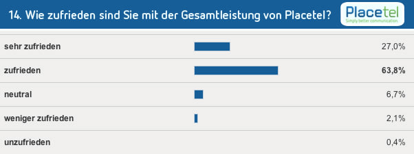 vor ein paar Wochen hatten wir Sie um Ihre Meinung zu Placetel und den angebotenen Leistungen gebeten. Die Ergebnisse der Placetel-Kundenumfrage liegen nun vor. An dieser Stelle erst mal ein großes Dankeschön an alle Kunden, die an der Befragung teilgenommen haben! Wir haben durch Ihre Teilnahme viele neue Anregungen, Verbesserungsvorschläge und Ideen erhalten. Insgesamt sind Sie jedoch bereits heute schon mit den Leistungen von Placetel zufrieden (>90% aller befragten Kunden). Dieses Ergebnis freut uns ungemein und zeigt, dass wir uns auf dem richtigen Weg befinden!