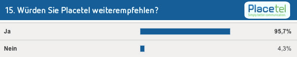 Insbesondere mit dem Preis-Leistungs-Verhältnis, dem Funktionsumfang sowie dem Faktor Sprachqualität konnten wir bei Ihnen punkten. 95,7% aller befragten Kunden würden Placetel daher weiterempfehlen. An diesem Vertrauensbeweis lassen wir uns in Zukunft gerne messen.