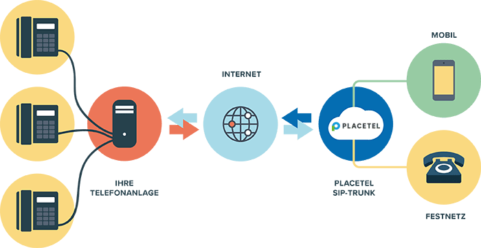 Ein Trunk ist ein Kanal oder eine virtuelle Telefonleitung, die die Telefonanlage mit einem Trunk-Anbieter verbindet. Hierbei werden die Sprachströme über das Internet übertragen. Ein SIP-Trunk kann eine ISDN-Telefonanlage ersetzen oder als Ergänzung zu einem Anlagenanschluss einer klassischen ISDN-Telefonanlage genutzt werden.