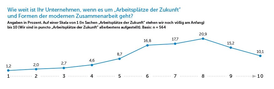Drei von vier Unternehmen sehen in Bezug auf die Digitalisierung Fortschritte und die Entwicklung smarter Workplaces und Mobilitätskonzepte ist von der Priorität in den einzelnen Unternehmen deutlich gestiegen. So ergab die Studie der IDG-Research, dass New Work aktuell das zweitwichtigste Projekt hinter der IT-Sicherheit darstellt. Von den befragten CIOs gaben mehr als 65% an, dass ihre Unternehmen in Bezug auf die digitale Transformation bereits weit vorangeschritten seien.
