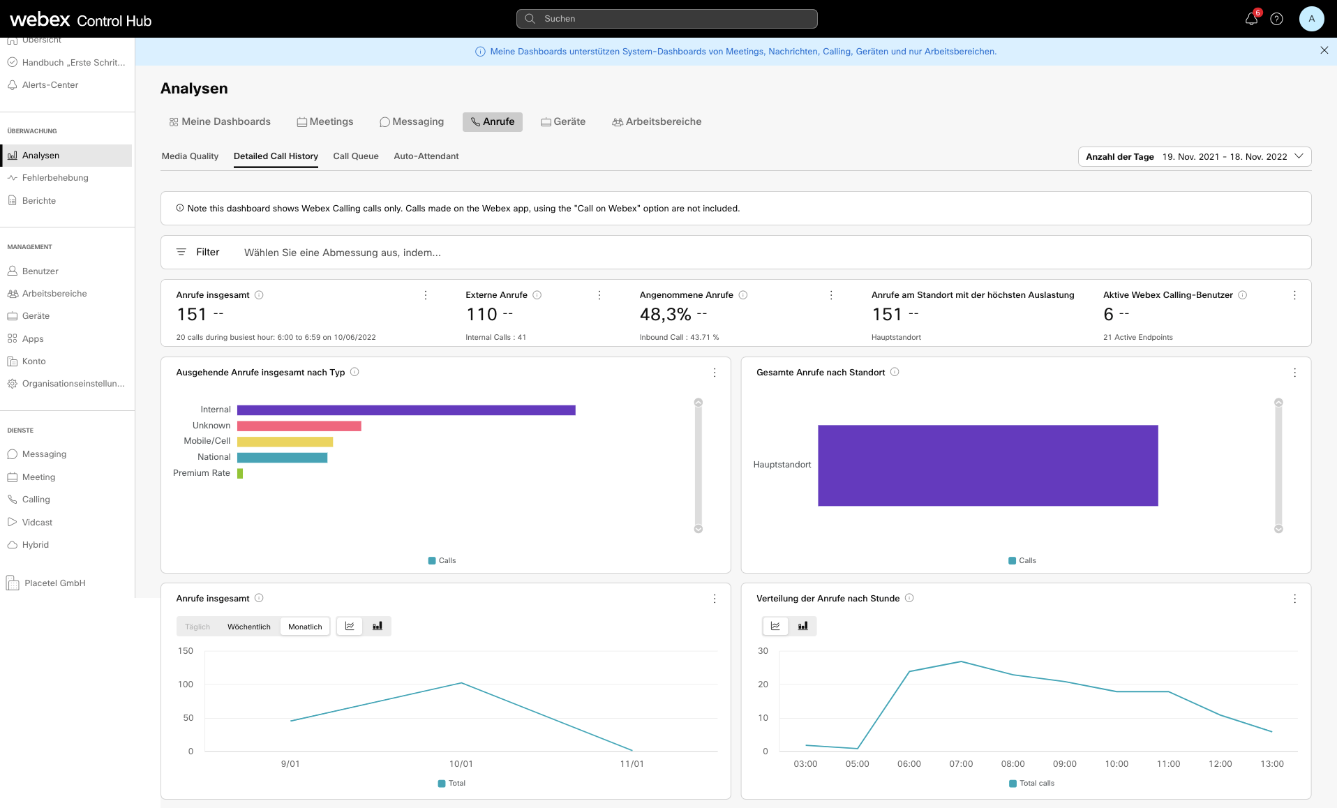 Aussagekräftige Daten sind so wichtig wie nie zuvor. Der Webex Control Hub liefert Ihnen interessante Einblicke in Echtzeit – mit einem Aktualisierungszyklus von nur 10 Minuten. Die Reportings helfen Ihnen dabei, Anwendungstrends zu erkennen, Schwachstellen im Unternehmen zu verstehen und Optimierungen einzuleiten. So können Sie zum Beispiel Ihre gesamte Anrufhistorie mit verpassten, angenommen und getätigten Anrufen einsehen, erhalten einen Überblick über die Anrufqualität oder können die Anzahl der gesendeten Nachrichten oder Meetings einsehen.