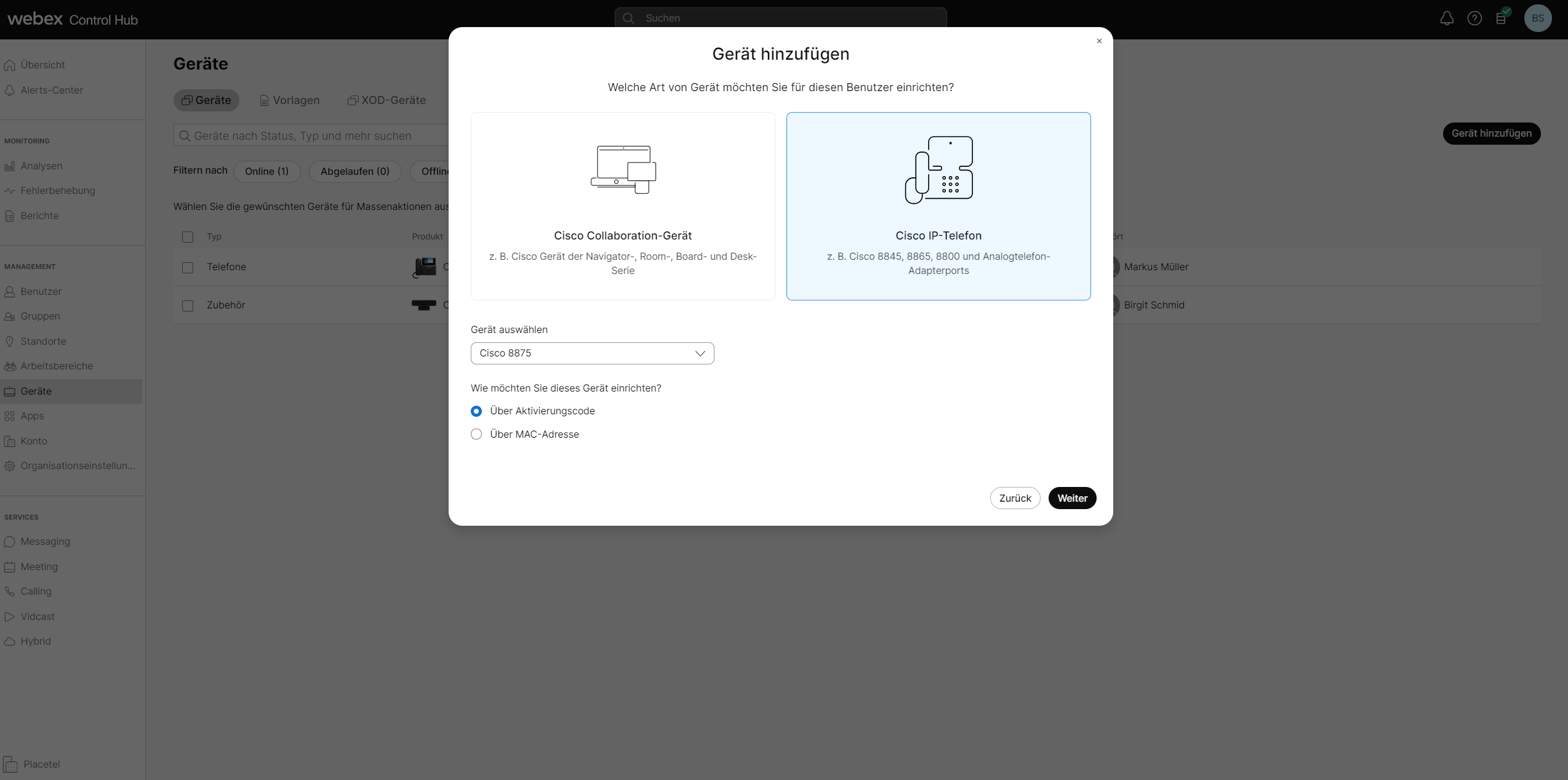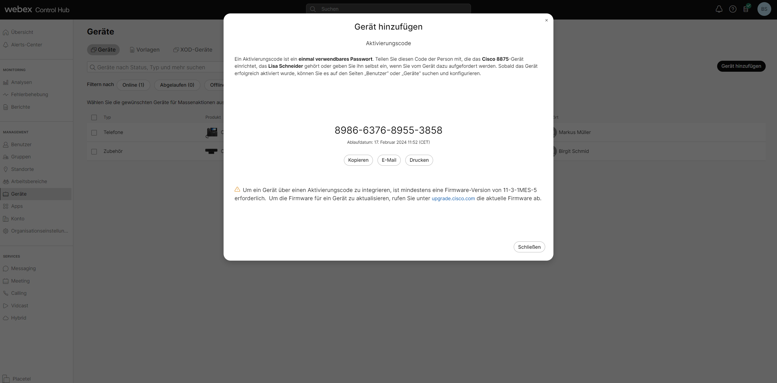 Für Cisco Endgeräte ist die Einrichtung alternativ auch per Aktivierungscode direkt am Gerät möglich. Mit Eingabe des 16-stelligen Codes beginnt die Autoprovisionierung und der Status des Geräts ändert sich im Control Hub automatisch auf grün (aktiv) – das Gerät ist dann sofort einsatzbereit.