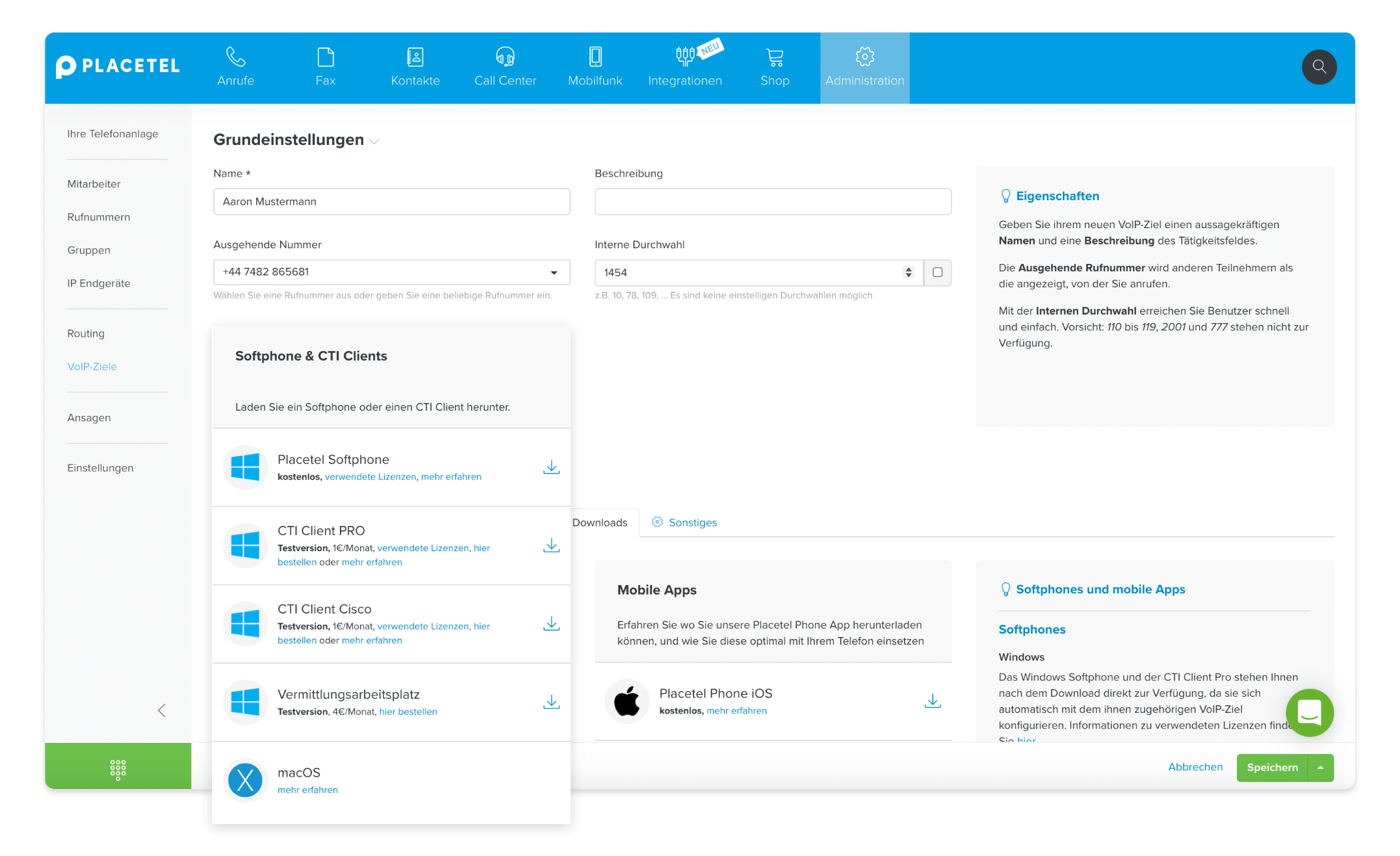 Den Download-Link für den CTI Client PRO & TAPI finden Sie im Webportal unter „Adminstration->VoIP-Ziele“.