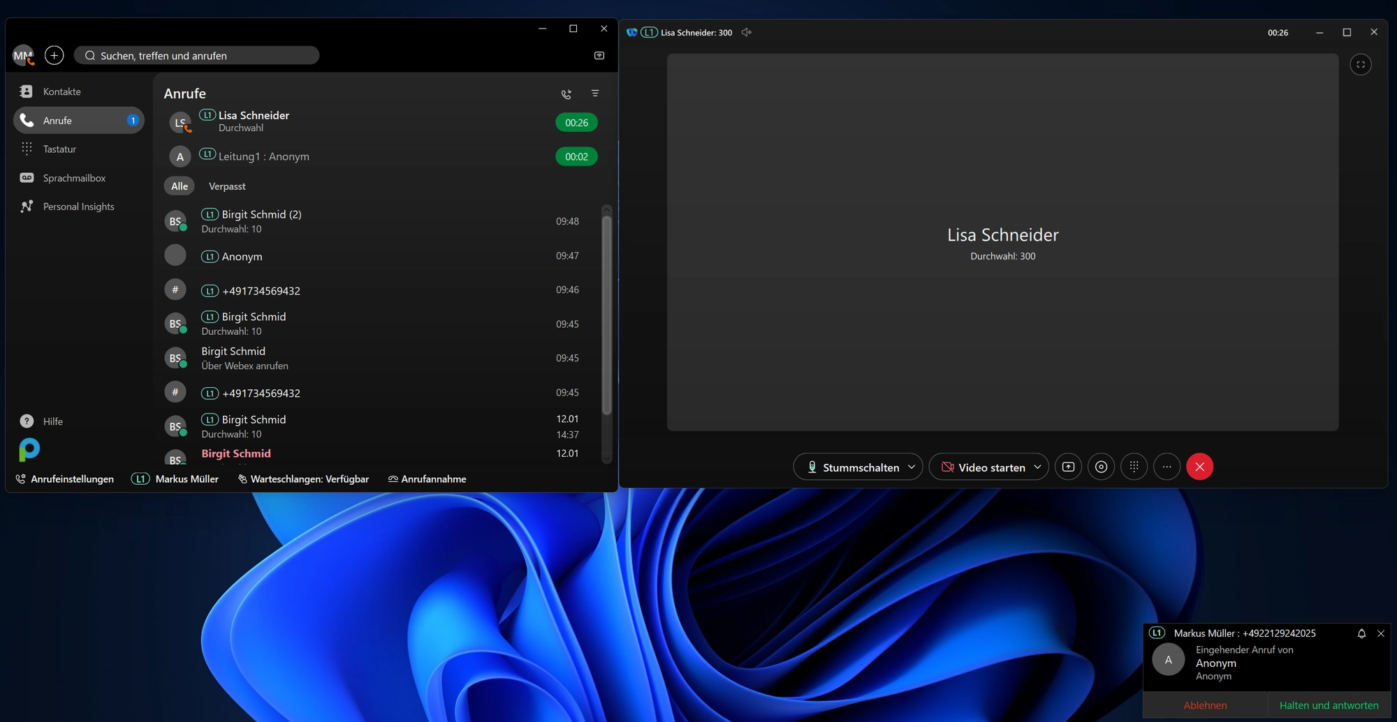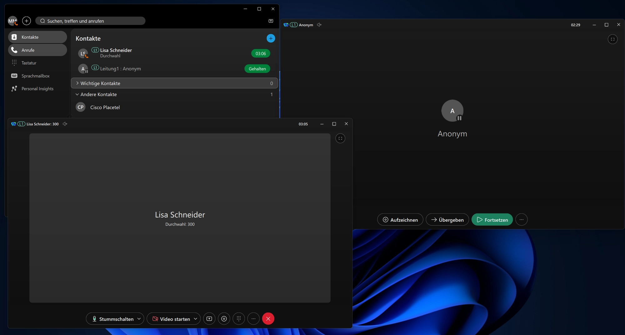 Im Webex Client ist ein Wechsel zwischen zwei Anrufern sehr einfach möglich. Mit nur einem Klick kann ein Anrufer gehalten und auch wieder fortgesetzt werden. -