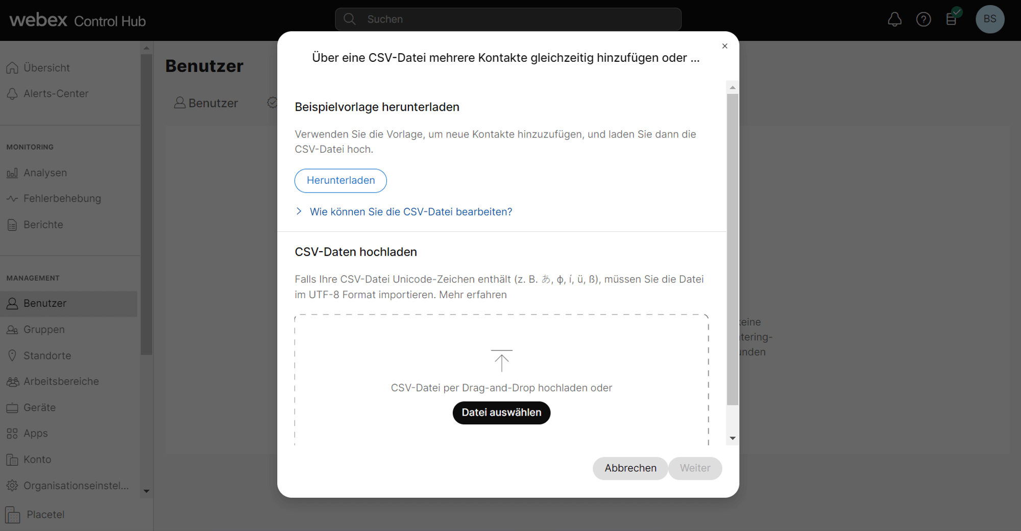 Ihre Kontakte können Sie ganz einfach im Control Hub über eine CSV-Datei importieren und verwalten (Hinzufügen, Löschen, Ändern oder Anzeigen). Die Vorlage dazu steht Ihnen im Control Hub zum Download zur Verfügung. Insgesamt können Sie bis zu 10.000 Kontakte gleichzeitig hochladen.