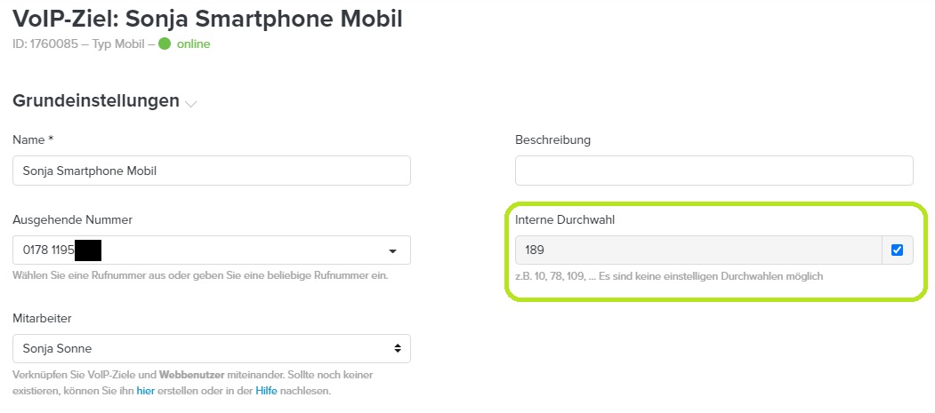 In beiden Fällen gelangen Sie in das Bearbeitungsmenü zu Ihrer Rufnummern. Dort können Sie eine interne Durchwahl eintragen und mit der Checkbox aktivieren.