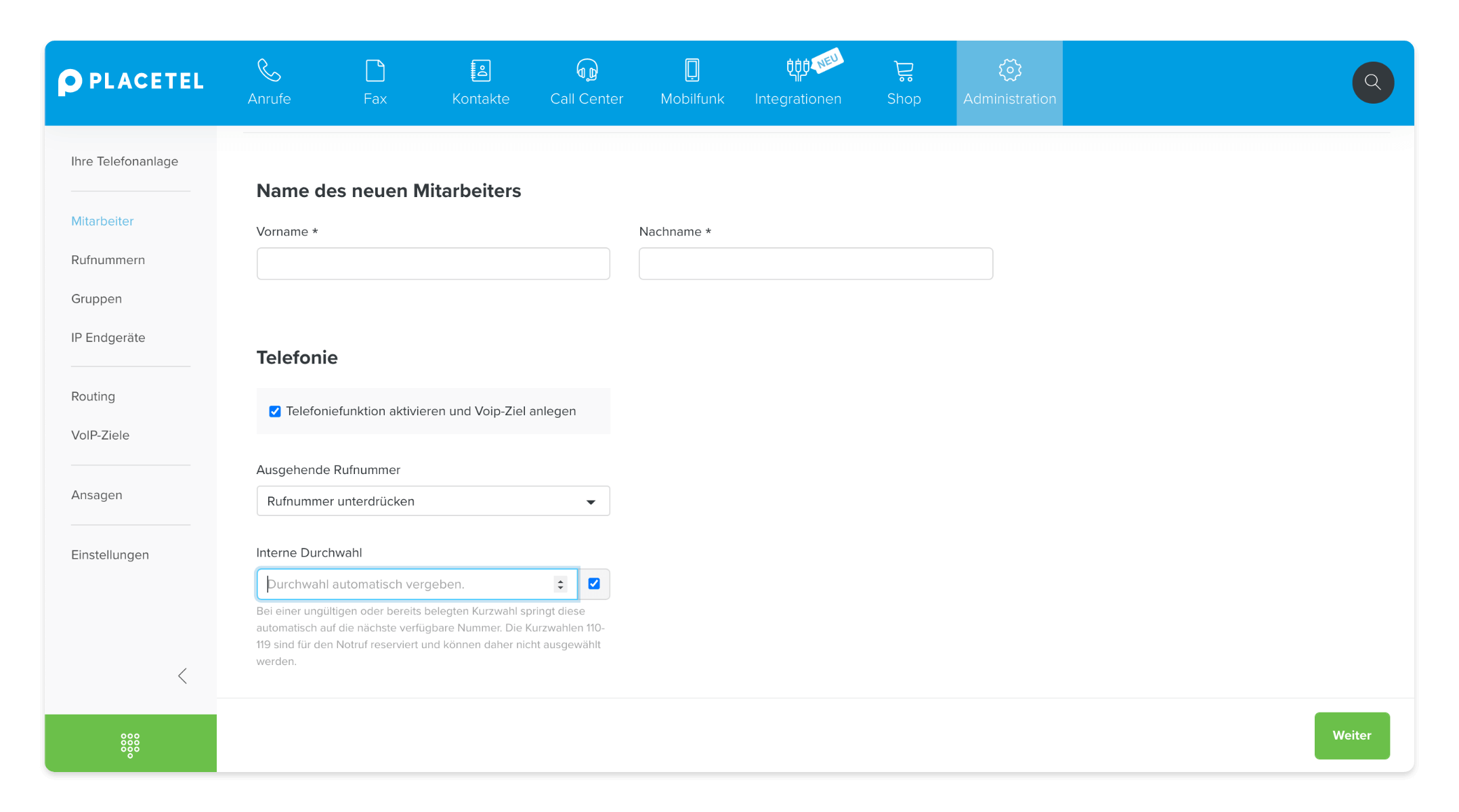 Im Placetel Webportal können Sie interne Durchwahlen für Ihre mobilen Nebenstellen vergeben. -