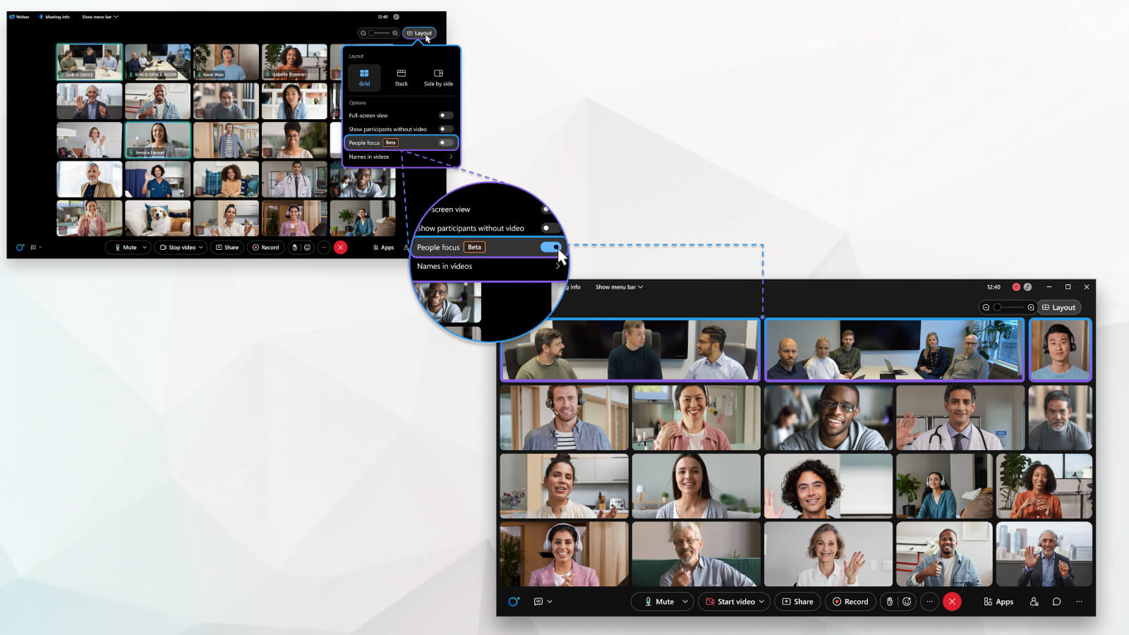 Ziel dieser Funktion ist es, die Interaktion und die Wahrnehmung der einzelnen Personen zu verbessern, indem diese automatisch ins Zentrum des Bildes gerückt werden. In der Rasteransicht verwendet People Focus künstliche Intelligenz, um Hintergründe zu reduzieren, um sich so besser auf die Mimik und Gestik der Teilnehmenden konzentrieren zu können. Dies sorgt nicht nur für eine persönlichere Atmosphäre, sondern erleichtert es auch, die nonverbale Kommunikation im Gespräch wahrzunehmen. Der Personenfokus richtet sich dabei nach den Positionen der Teilnehmer vor der Kamera und kann dynamisch auf deren Bewegungen reagieren. So bleiben sprechende Personen stets im Mittelpunkt, selbst wenn sie sich während des Meetings bewegen.
