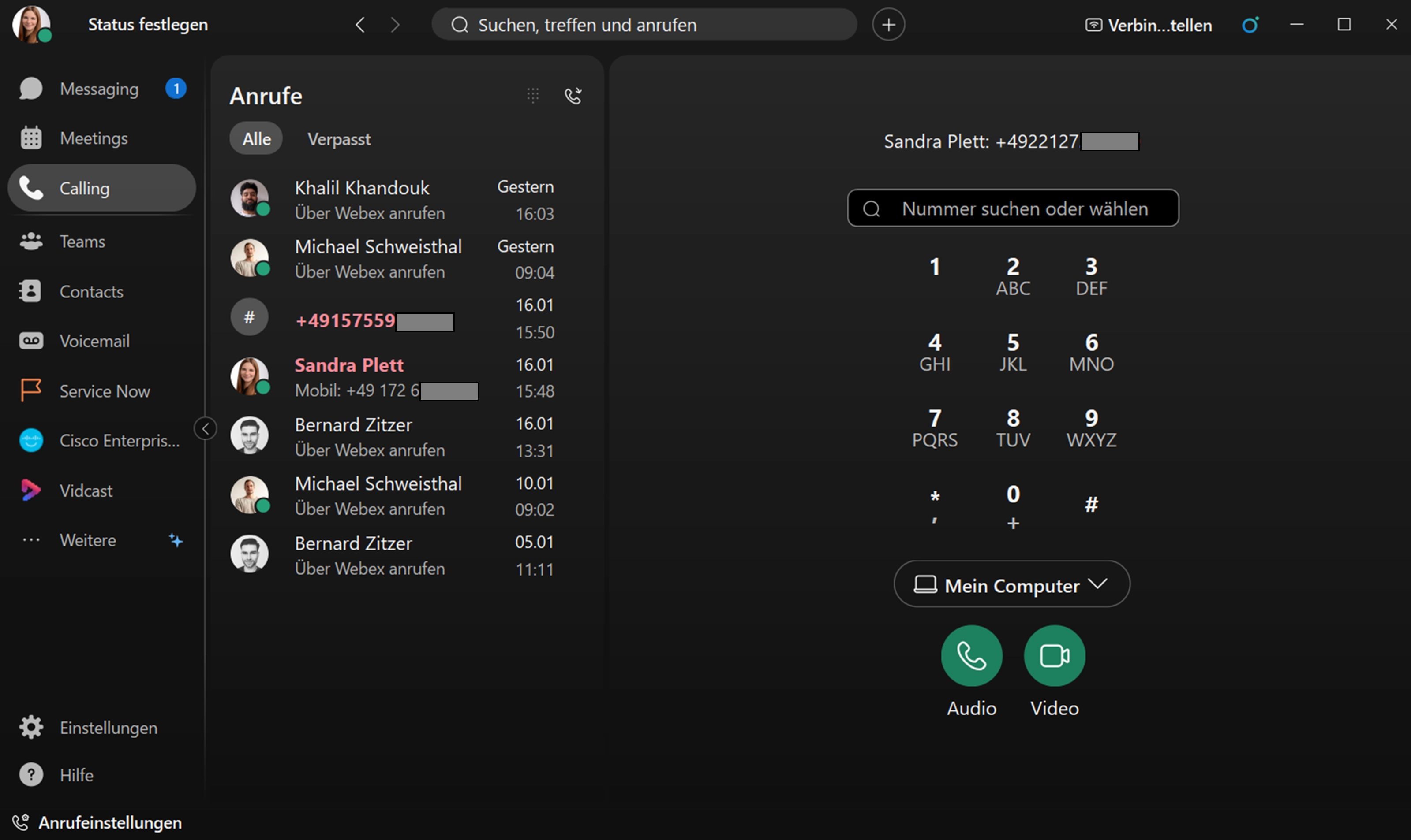 Gespeicherte Kontakte werden im Webex Client direkt mit Namen angezeigt. Für die anderen wird die Rufnummer eingeblendet, sofern der Anrufer nicht mit unterdrückter Nummer anruft. -