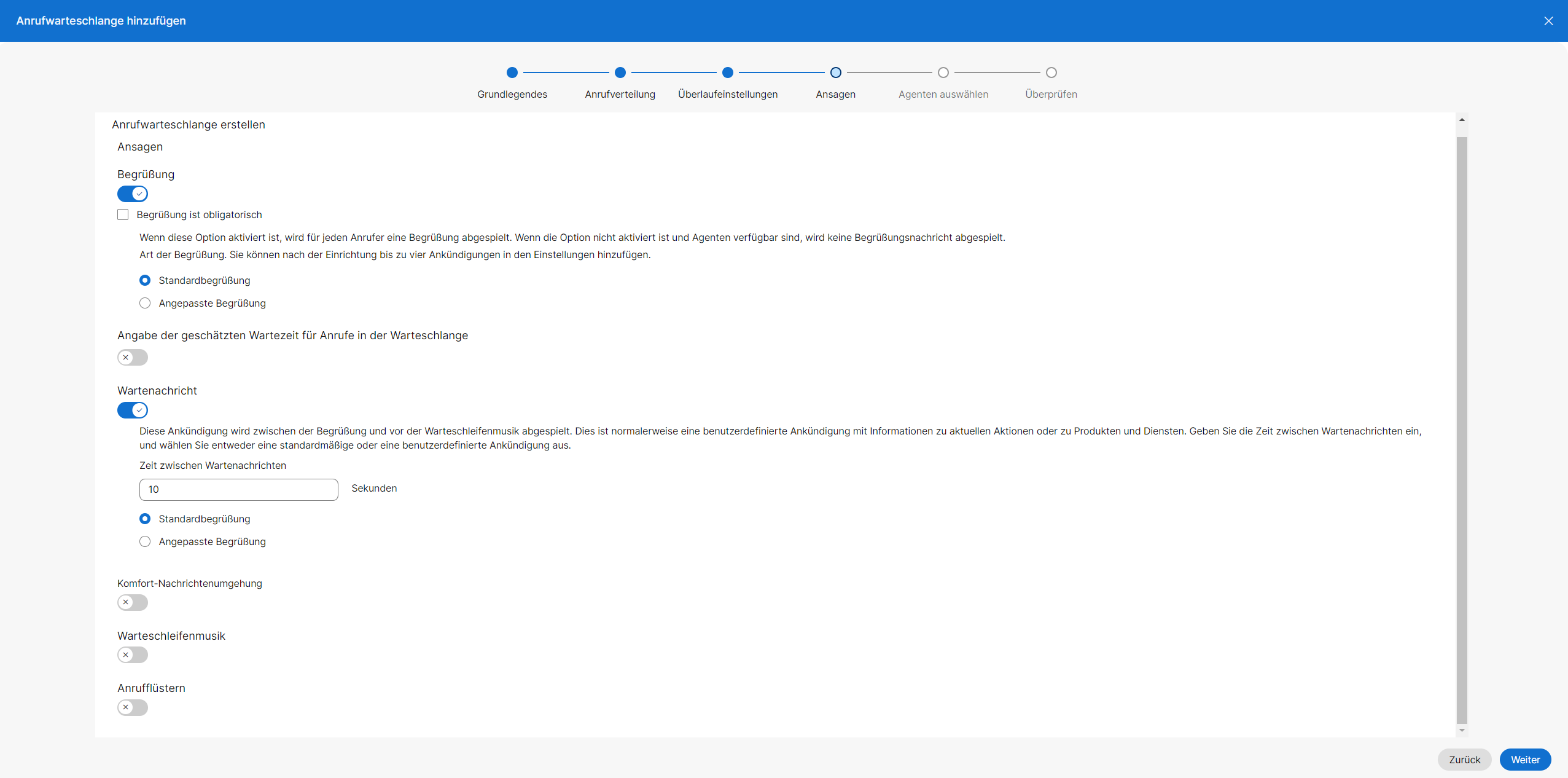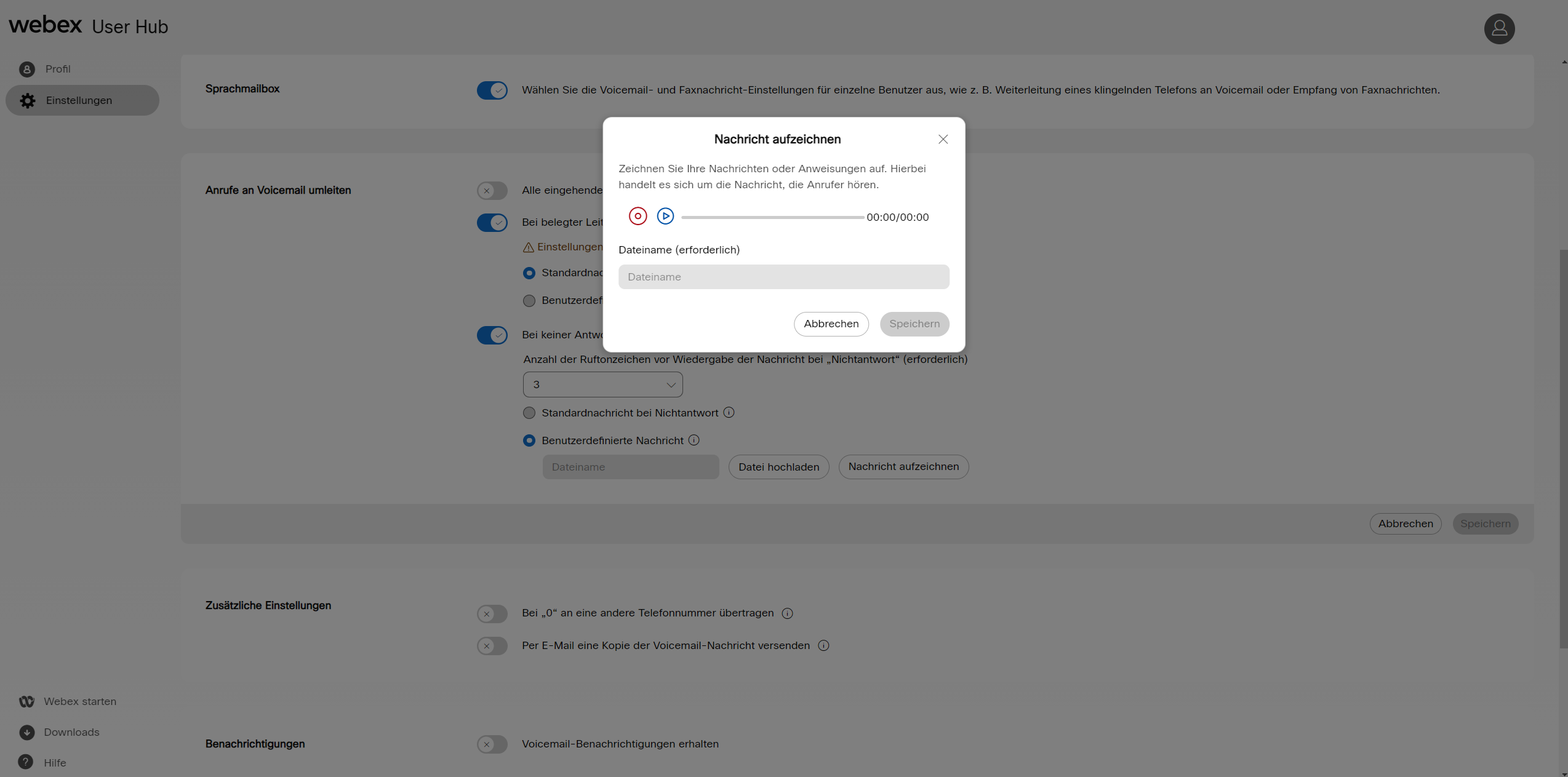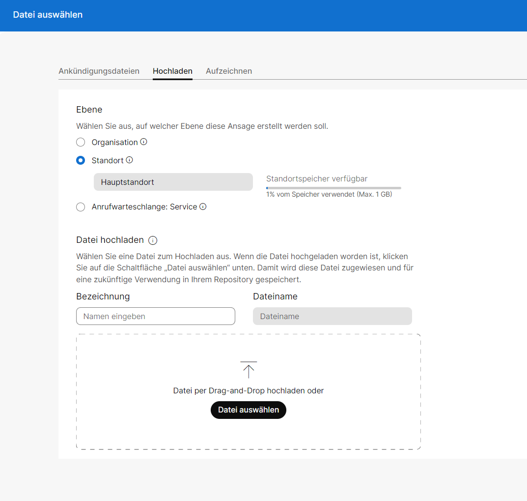 Ansagen, die Sie selber hochladen, müssen dabei immer in einem entsprechenden Format, bspw. als .wav-Datei hochgeladen werden. Die Anforderungen an die Datei können Sie dabei immer dem kleinen Info i neben “Benutzerdefinierte Nachricht” entnehmen.