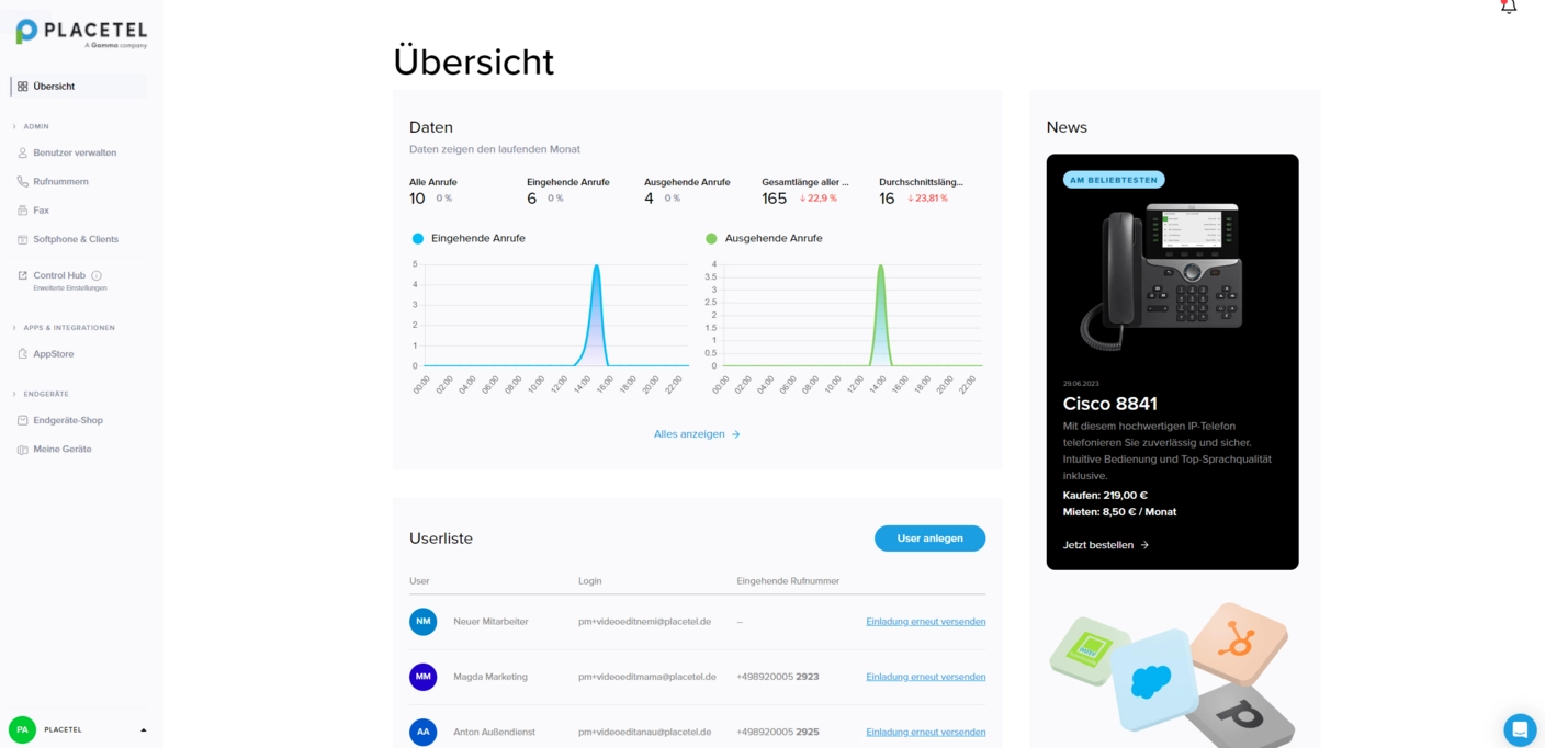 Hier verwalten Sie Ihren Leistungsumfang und Grundeinstellungen. Legen Sie ganz einfach neue Mitarbeiter an, fügen Sie neue Rufnummern hinzu oder bestellen Sie Optionen wie Flatrates und Integrationen. So können Sie alles über eine zentrale Benutzeroberfläche steuern und den Leistungsumfang immer auf Ihre individuellen Bedürfnisse anpassen.