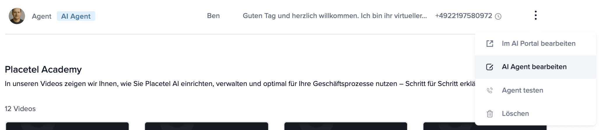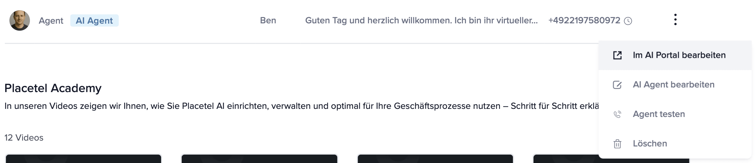 Nachdem Sie sich angemeldet haben, navigieren Sie zum Menü Placetel AI und suchen Sie den Agenten, den Sie bearbeiten möchten.