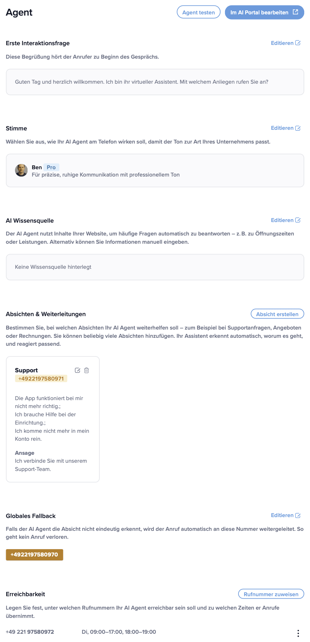 - Erreichbarkeit: Ändern oder entfernen Sie die zugewiesene erreichbare Nummer für diesen AI-Agenten.