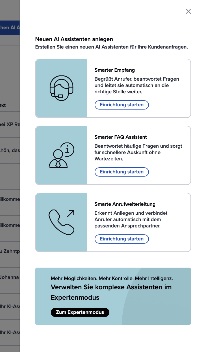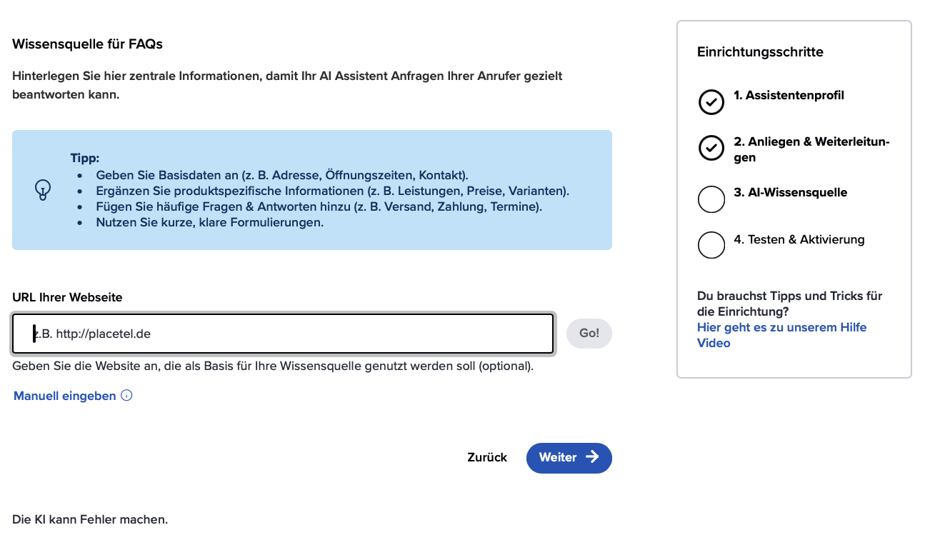 Für einen reibungslosen und schnellen Start mit Placetel AI können Sie KI-Agenten mit einem einfachen Klick in unserem Placetel Portal einrichten.