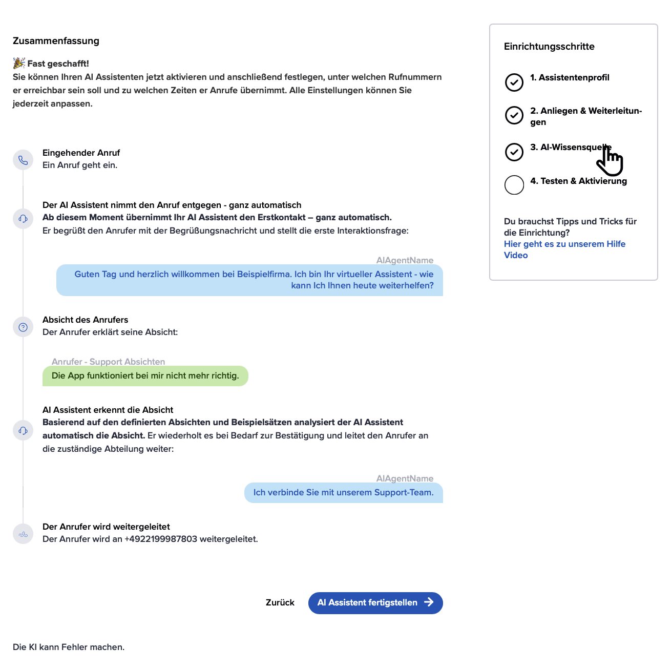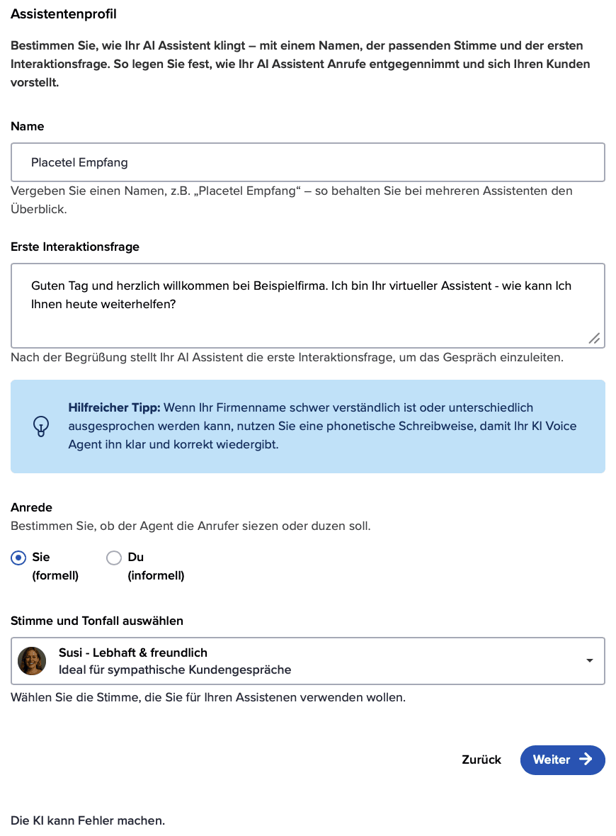 ✔Schreiben Sie einen passenden, beschreibenden Namen für Ihren KI-Agenten. ✔ Schreiben Sie dann den ersten Satz, den der AI-Agent bei Eingang des Anrufs sagen soll. Passen Sie ihn an, indem Sie den Namen Ihres Unternehmens einfügen. ✔ Bestimmen Sie, ob der Agent die Anrufer siezen oder duzen soll. ✔ Wählen Sie die Stimme, die Sie für Ihren Assistenten verwenden wollen. ✔ Klicken sie auf Weiter |