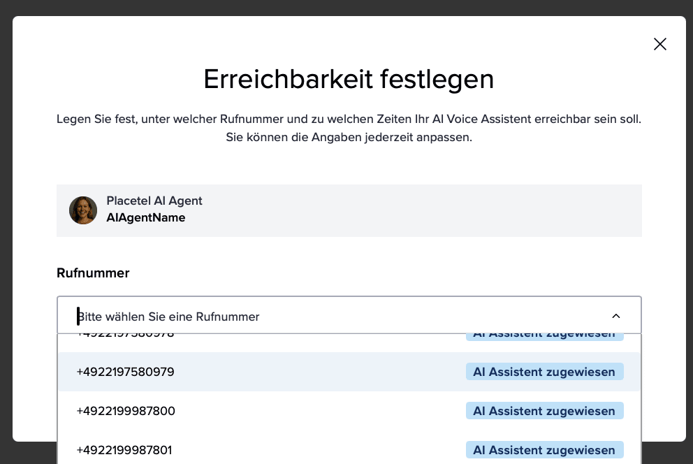 - Wählen Sie die gewünschte Nummer aus unter Rufnummer, unter der Ihre Kunden Sie über den AI-Agenten erreichen können.