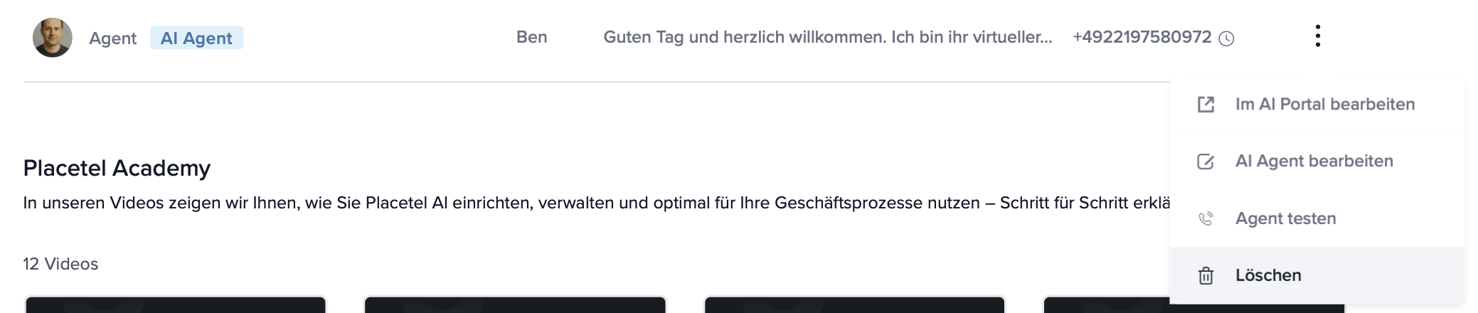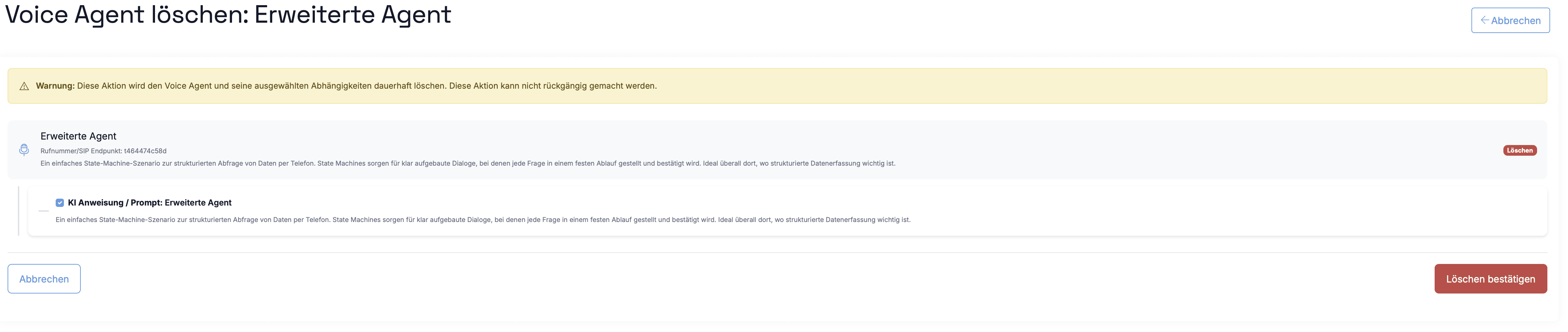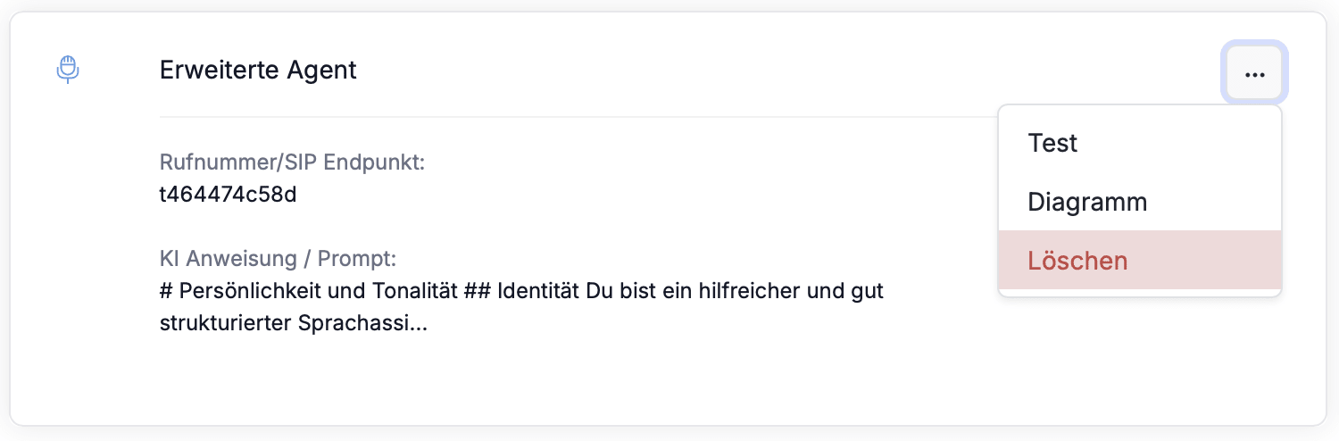 Das Löschen komplexer Agenten erfolgt ausschließlich über Placetel AI Portal.