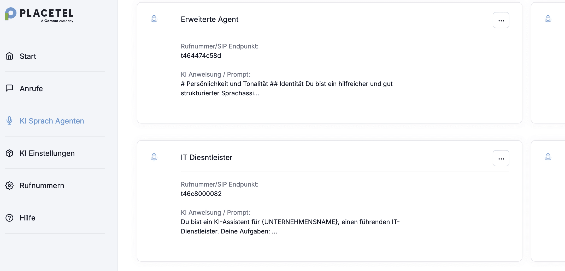 Nachdem Sie sich angemeldet haben, navigieren Sie zum Menü Placetel AI und suchen Sie den Agenten, den Sie löschen möchten.