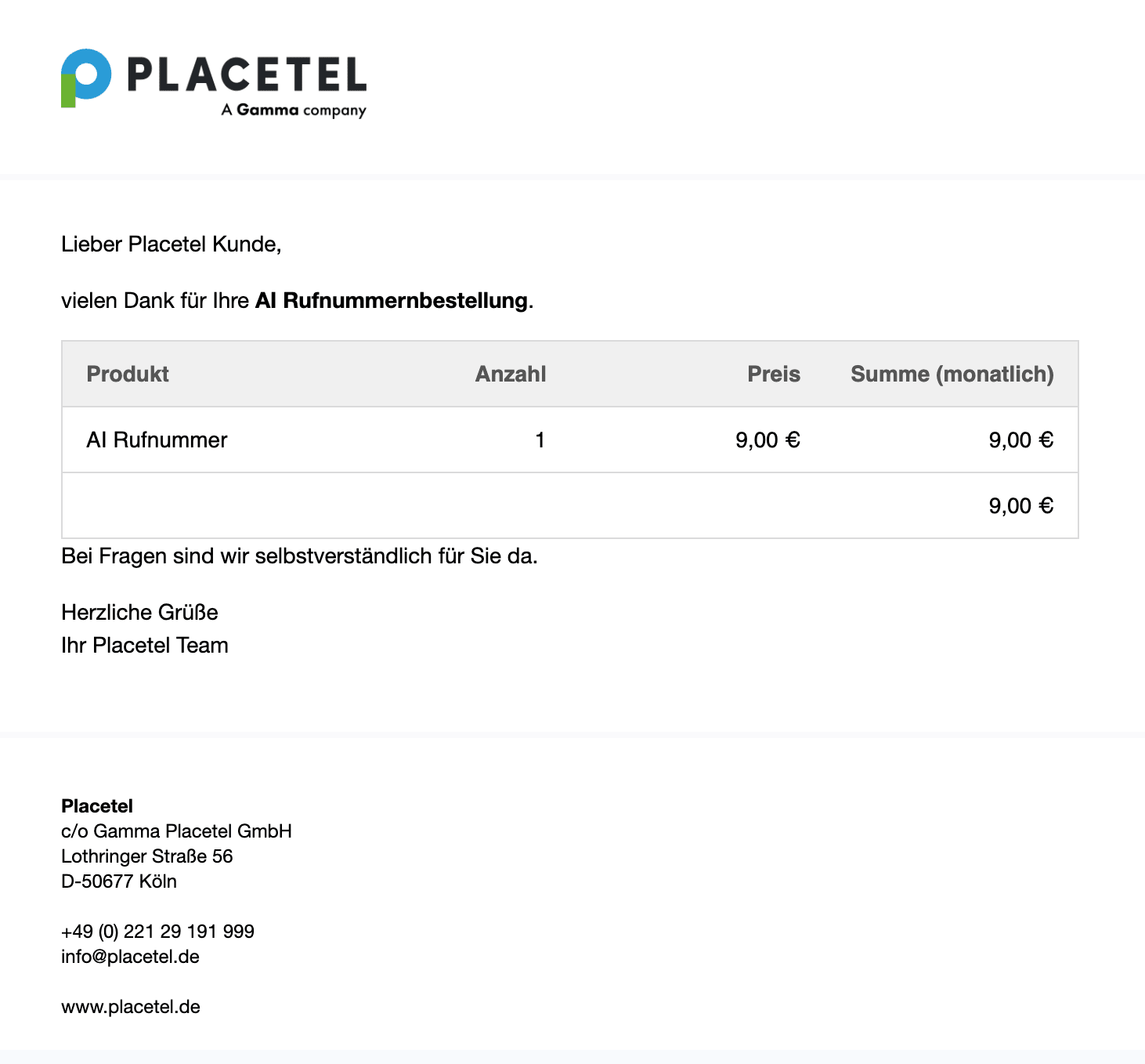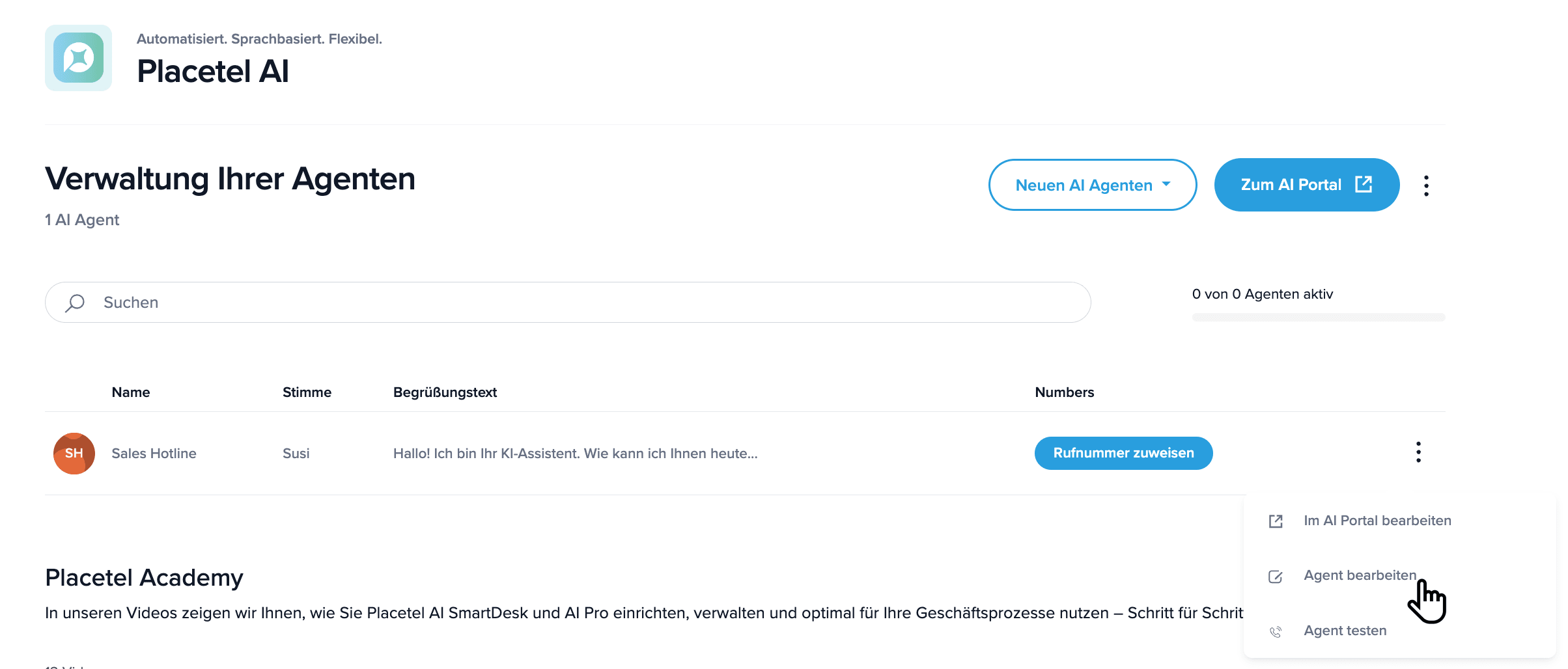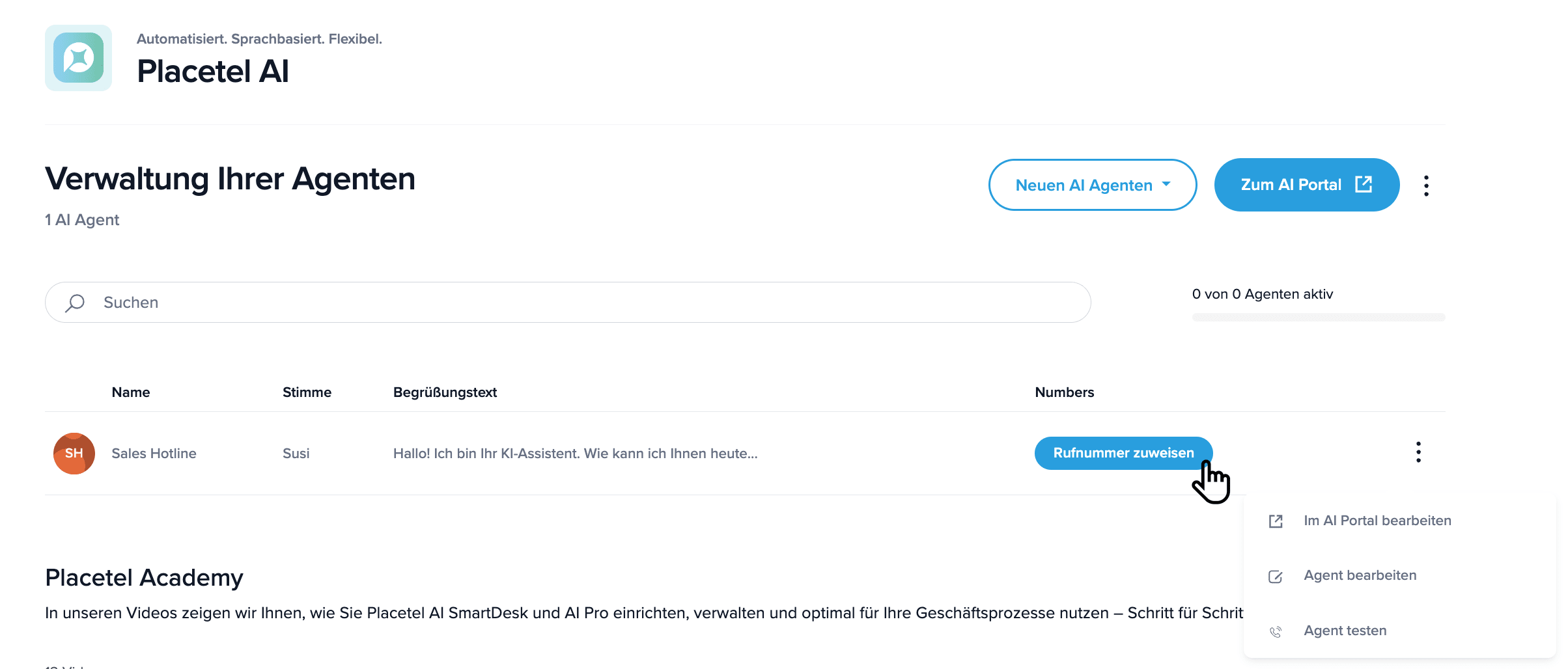 Die dem AI-Agenten zugewiesenen Rufnummern werden separat abgerechnet (siehe Placetel AI Preisliste).