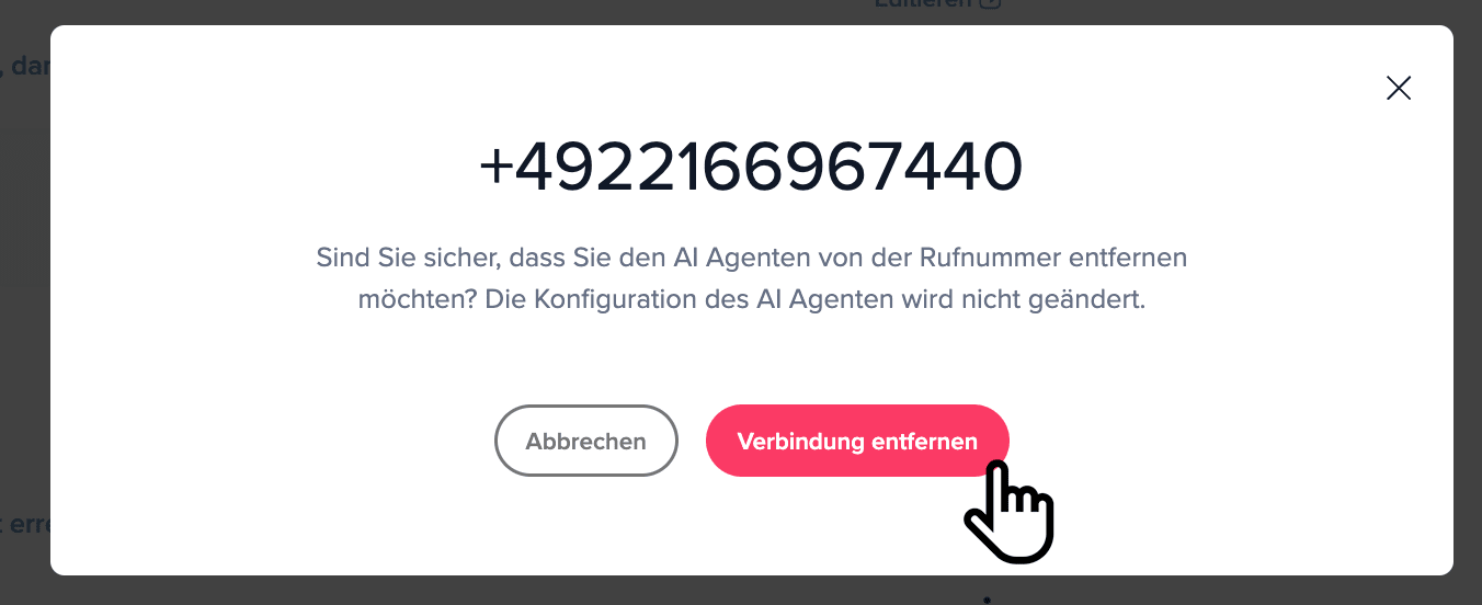 Wenn Sie sich entscheiden, Ihre Placetel AI aktiv zu behalten, um den Verlust Ihrer AI-Agent- Einstellungen zu vermeiden, können Sie die Rufnummer von Ihrem Agenten entfernen. Somit entfallen die 9€ monatliche Gebühr für die AI-Agent-Rufnummer.