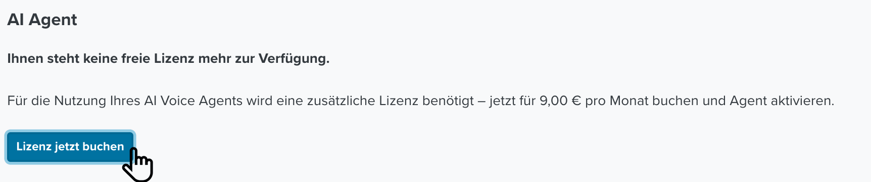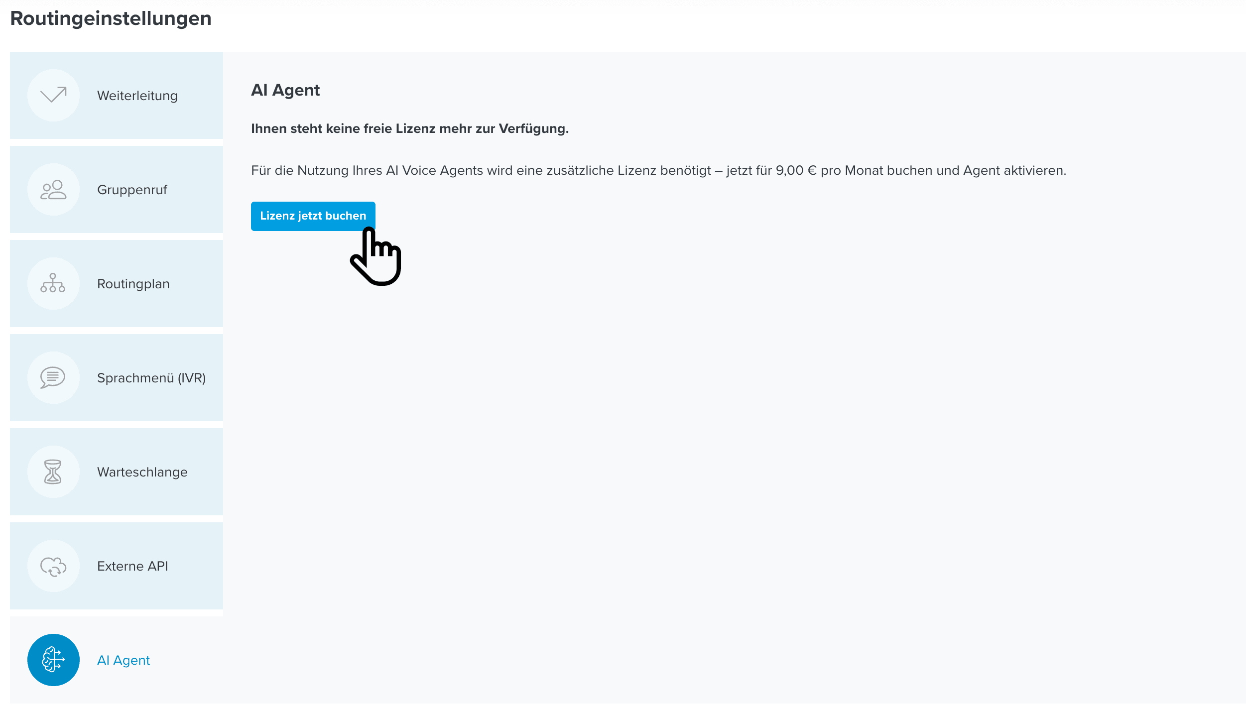 Navigieren Sie zu AI Agent und buchen Sie eine Lizenz für die Nutzung der AI-Rufnummer.