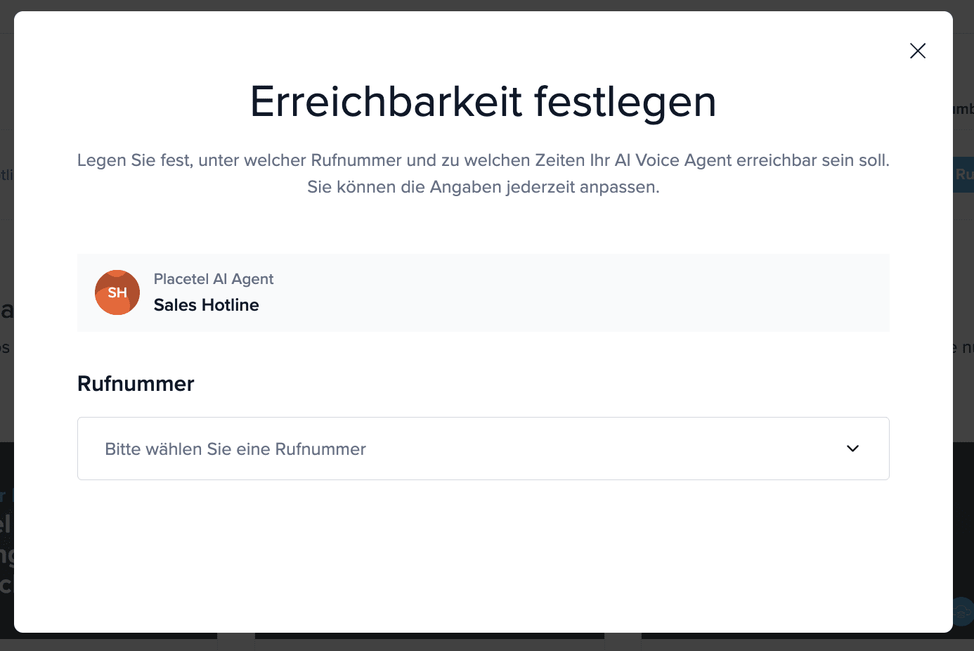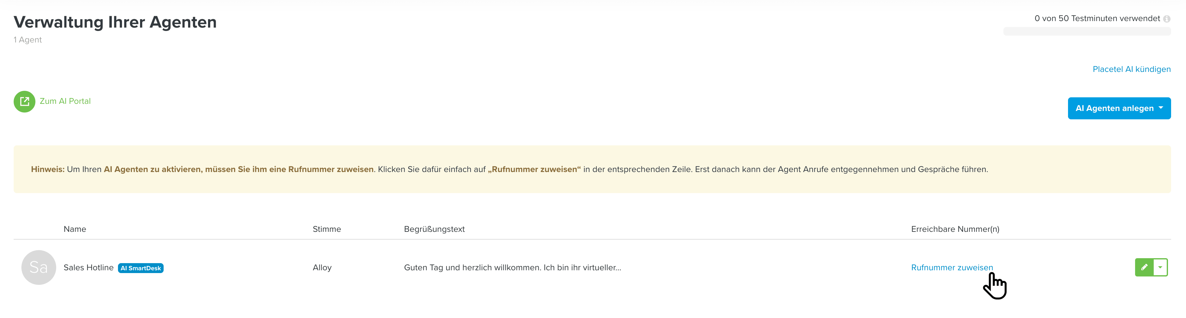 Bitte beachten Sie, dass Sie als Testkunde oder Bestandskunde für 30 Tage kostenlos eine beliebige Rufnummer ihrem AI-Agenten zuweisen können. Die 30 Tage werden ab dem Zeitpunkt gezählt, ab dem Sie Placetel AI buchen oder Ihre Placetel AI Testphase beginnt und nicht ab dem Zeitpunkt, ab dem Sie die Rufnummer zuweisen.