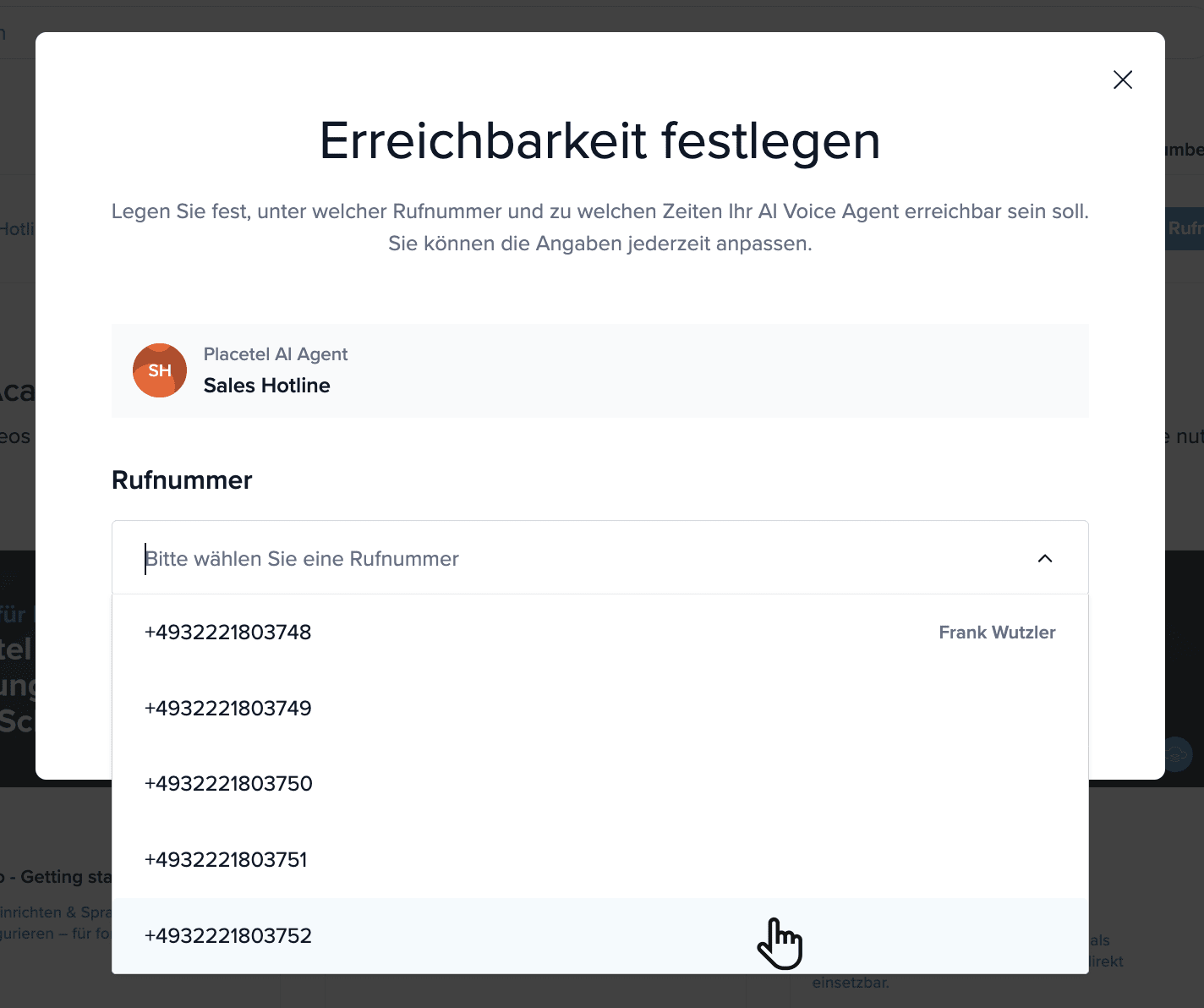 Wählen Sie eine Rufnummer aus, unter der Ihr AI-Agent eingehend erreichbar sein soll.