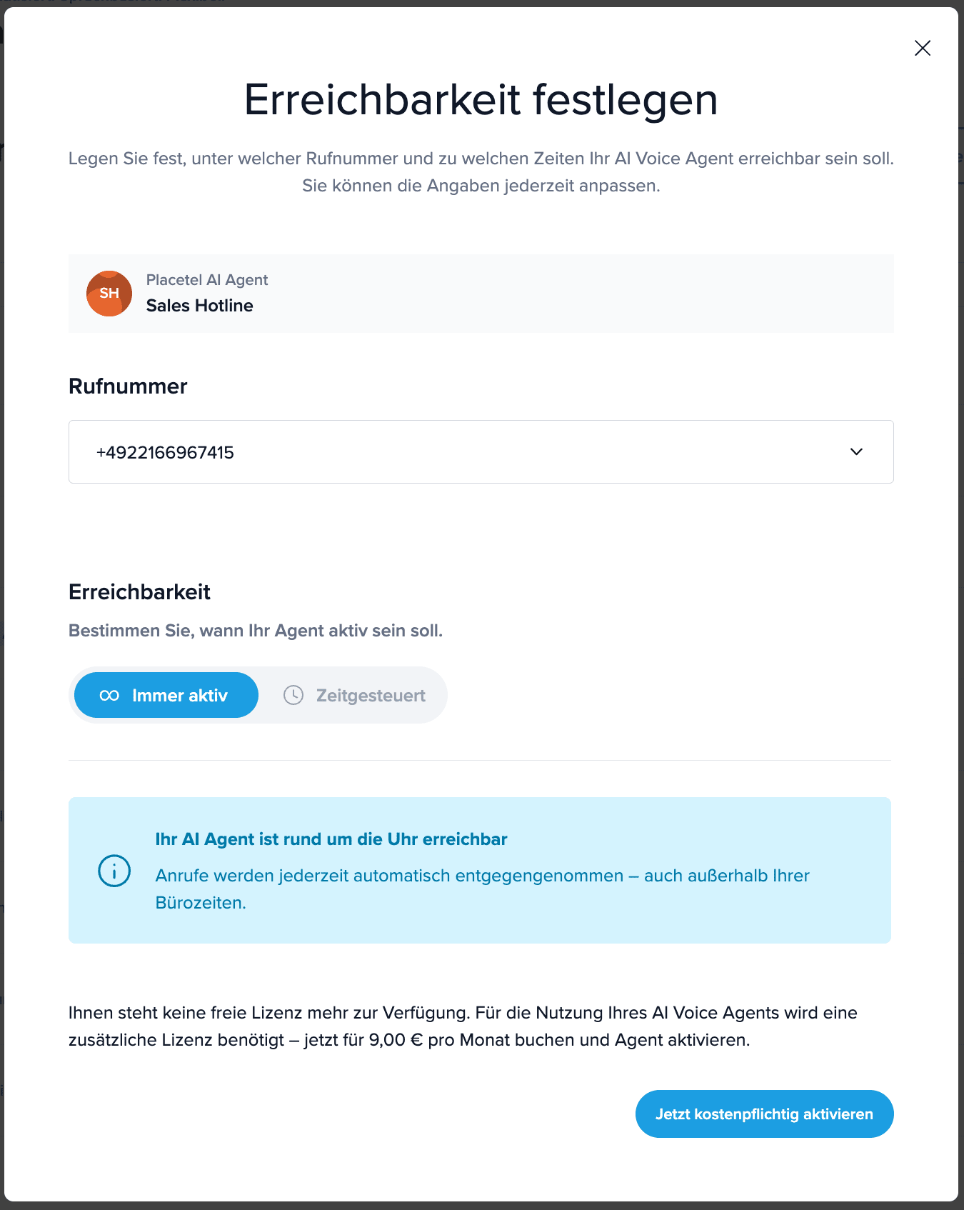 Bitte beachten Sie, dass Sie als Testkunde oder Bestandskunde für 30 Tage kostenlos beliebige Rufnummern ihren AI-Agenten zuweisen können, auch wenn Ihnen „Jetzt Kostenpflichtig aktivieren“ angezeigt wird. Die Abrechnung dieser Rufnummern startet erst nach 30 Tagen.