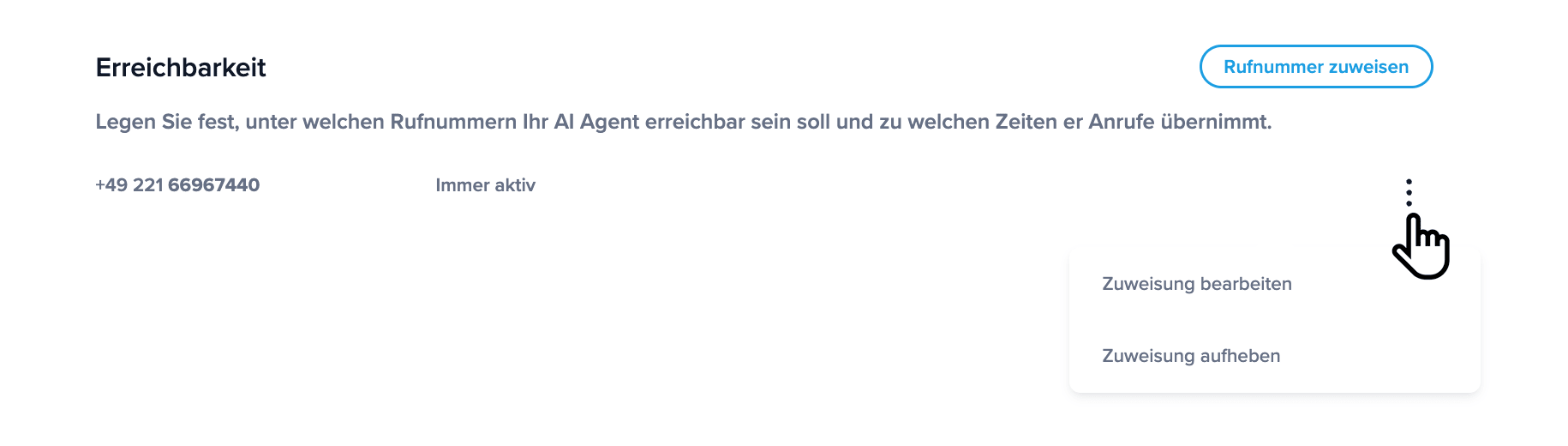 Klicken Sie direkt auf Rufnummer zuweisen, um Ihrem AI-Agenten eine erreichbare Nummer zuzuweisen.