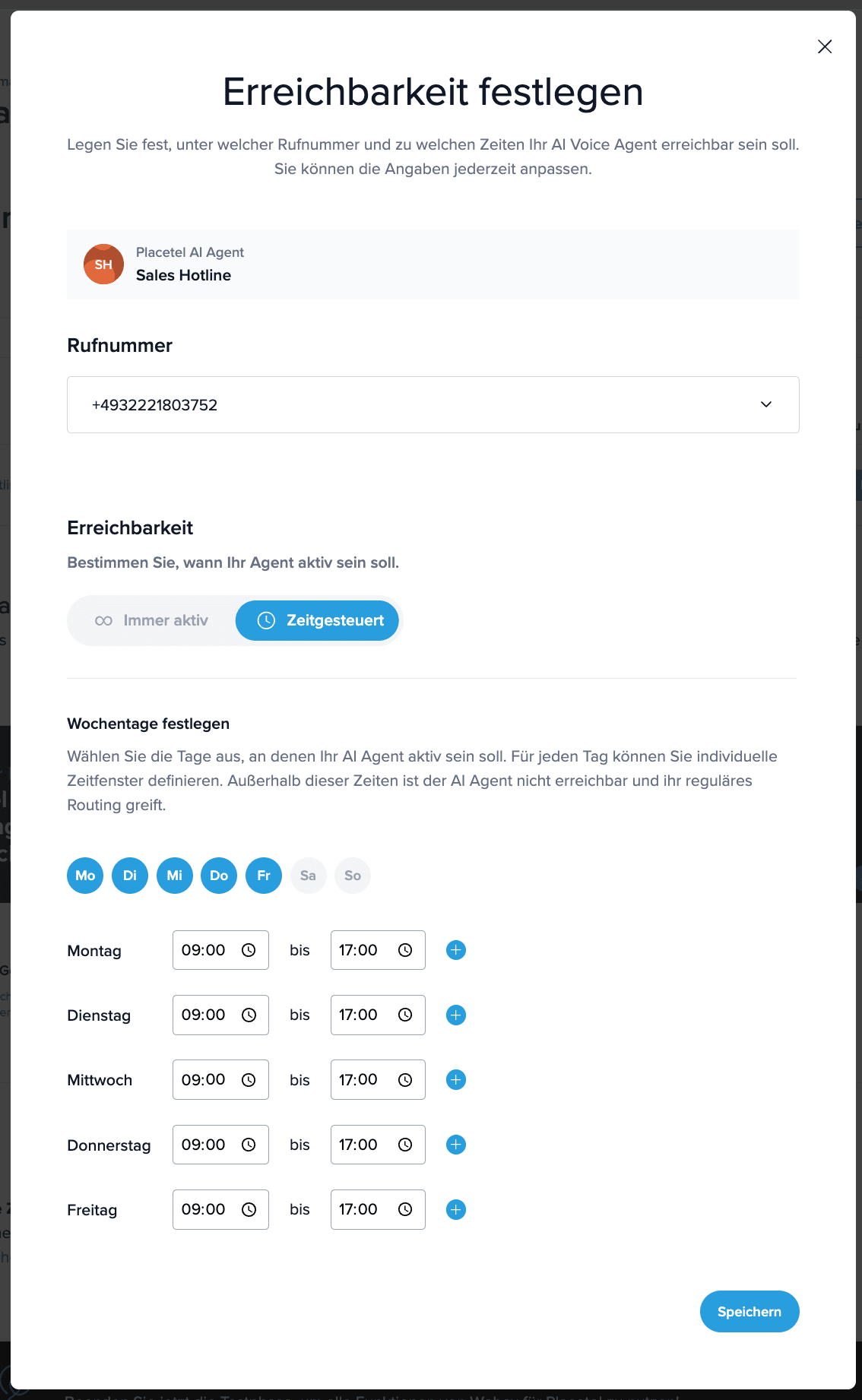 Sie können wählen, ob der AI-Agent rund um die Uhr erreichbar sein soll oder nur an bestimmten Wochentagen und zu bestimmten Zeiten.