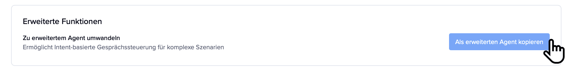 - Scrollen Sie nach unten, bis Sie Erweiterte Funktionen sehen, und klicken Sie dann auf Als erweiterten Agenten kopieren