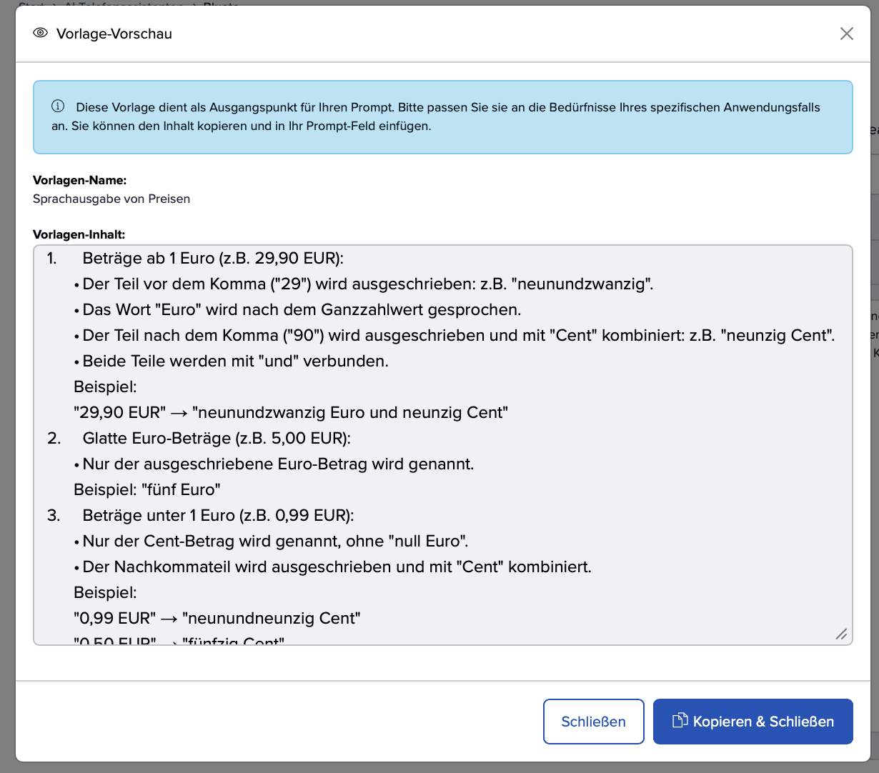 kopieren Sie es durch Klicken auf Kopieren & Spließen und fügen Sie es in den Abschnitt Systemaufforderung ein.