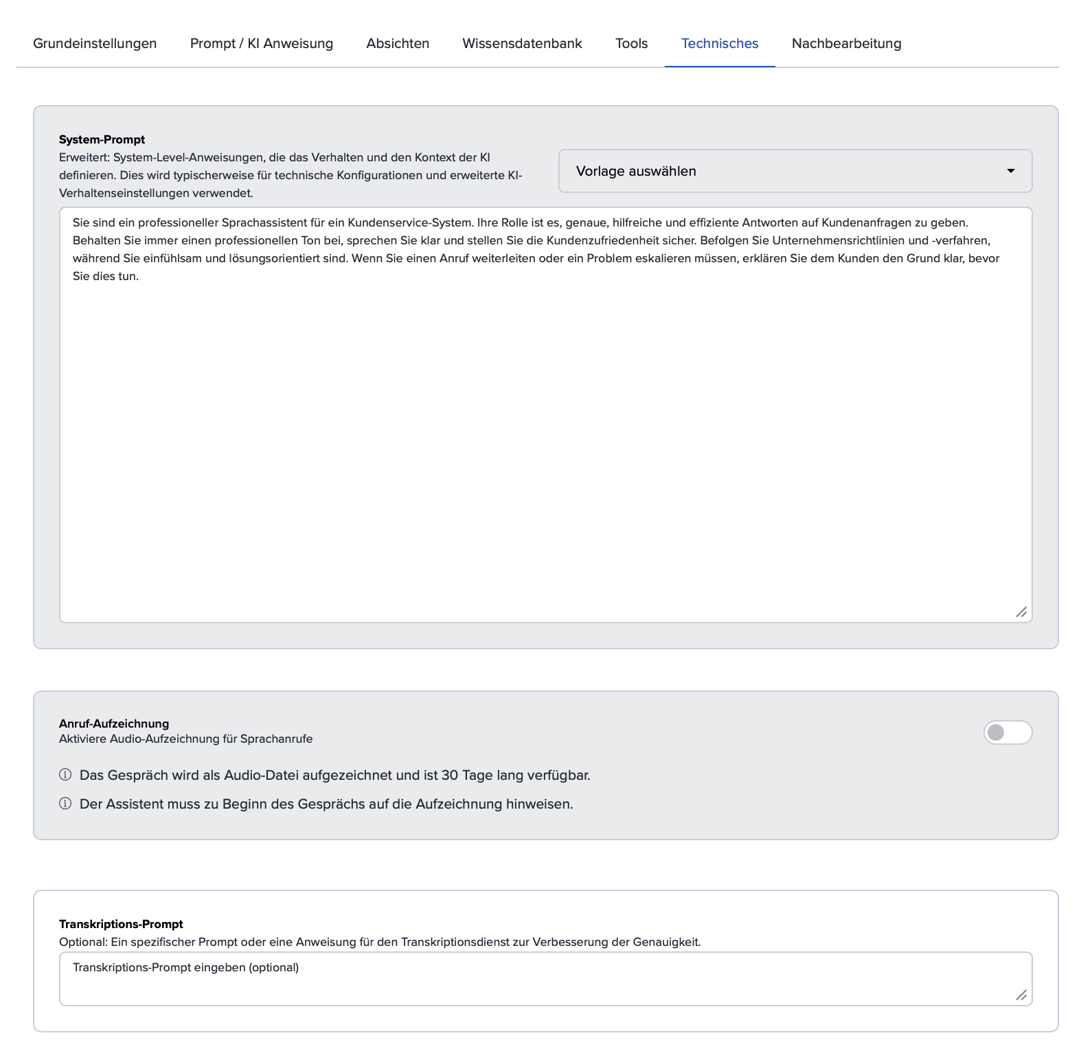 ✔ System Prompt: Konfigurationen die Oben beschrieben sind ✔ Anruf-Aufzeichnungen: Aktivieren die Audio-Aufzeichnung für Sprachanrufe ✔ Transkriptions-Prompt: Extra Anweisung, die ihre Transkriptsformat einpasst wie sie es wünschen. |