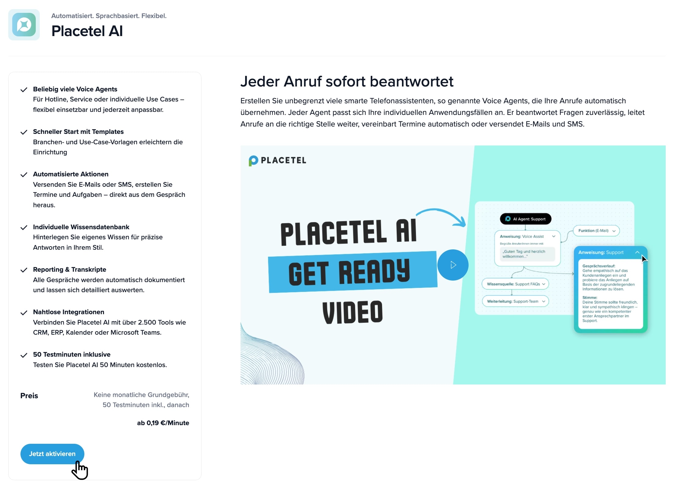 Auf dieser Seite finden Sie ein Einführungsvideo zu Placetel AI. Um Ihre Testphase zu starten, klicken Sie auf den Button jetzt aktivieren.