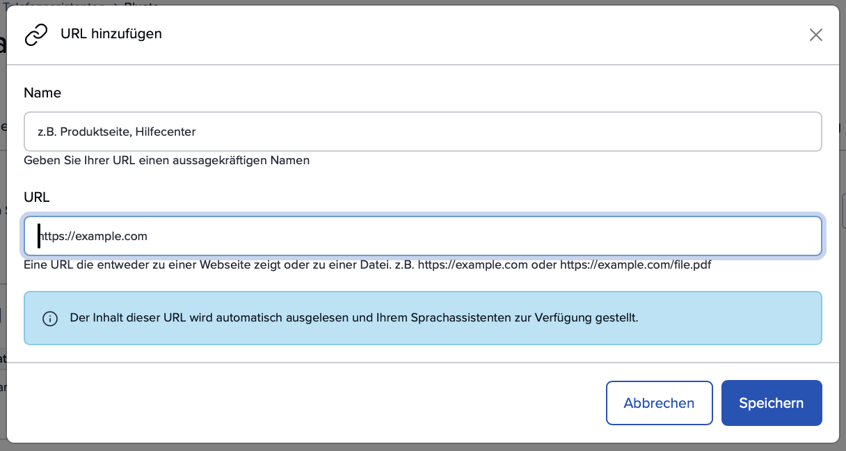 ✔ URL ![]() ✔ Einen eindeutigen Namen für Ihr Wissen eingeben. ✔ Link zur Unternehmenswebsite eingeben. ✔ Auf Speichern Klicken. |