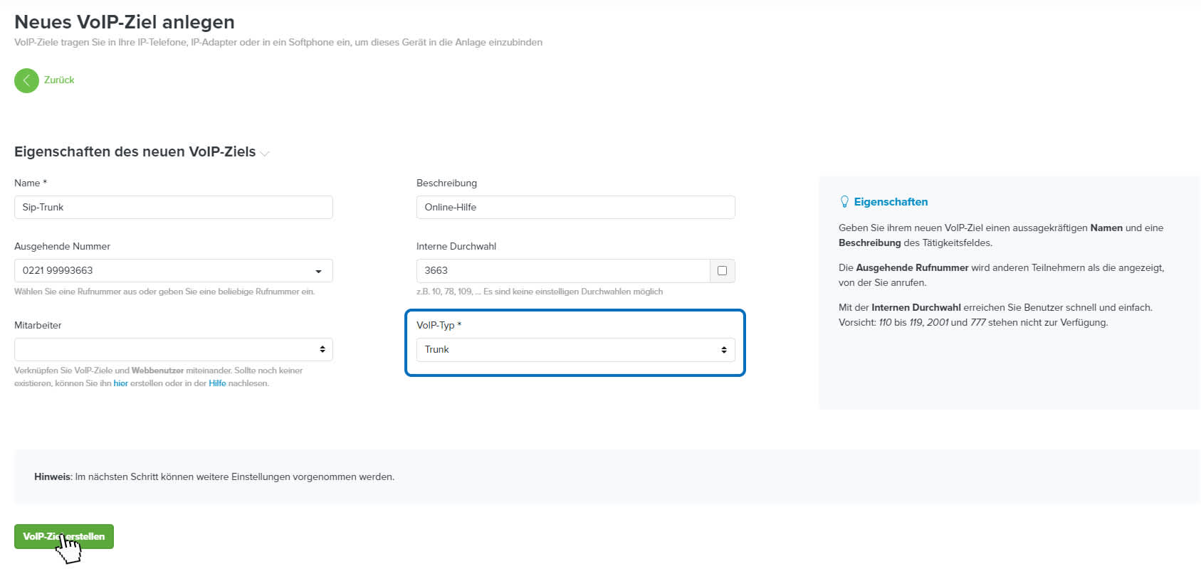Tragen Sie Daten zu Ihrem VoIP-Ziel ein Bestätigen Sie dann Ihre Eingaben per Klick auf den VoIP-Ziel erstellen-Button.