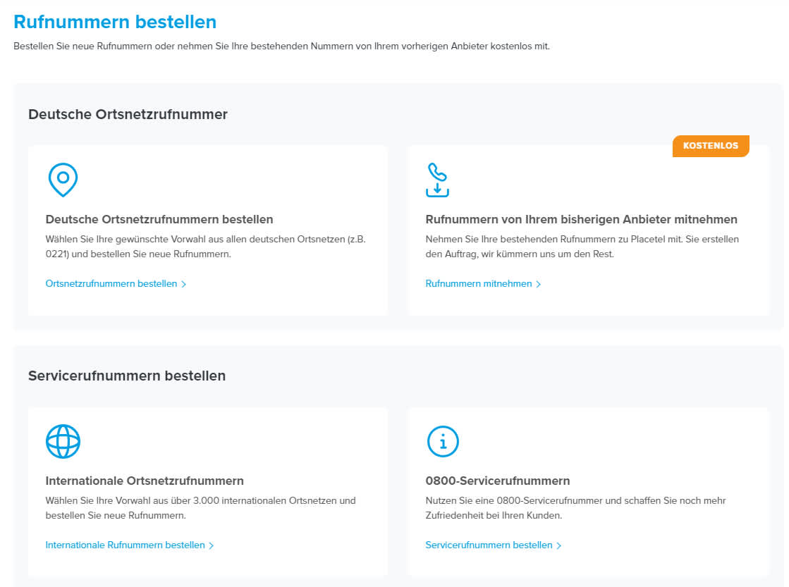 Hier erhalten Sie einen Überblick über sämtliche Bestellmöglichkeiten, die es bei Placetel gibt.