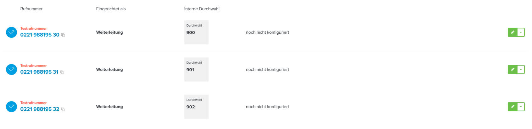 Die Freischaltung von Testrufnummern erfolgt im Menüpunkt „Administration“, und dann im Unterpunkt „Rufnummern“. Hier müssen Sie den Button „Testrufnummern aktivieren“ drücken. Danach stehen Ihnen die Testrufnummern direkt zur Verfügung. Die Testrufnummern haben eine Kölner Vorwahl 0221. Bitte beachten Sie jedoch, dass Anrufe ins Ausland während der Testphase nicht gestattet sind.