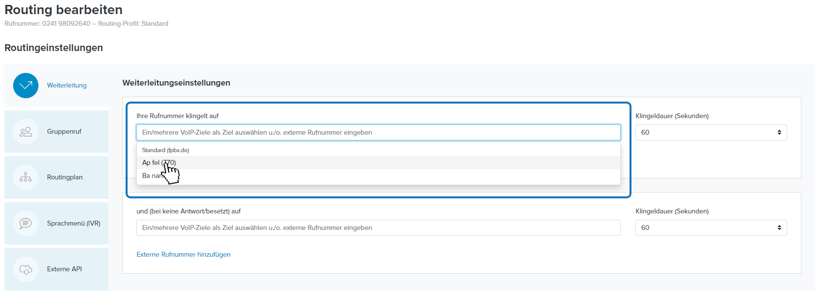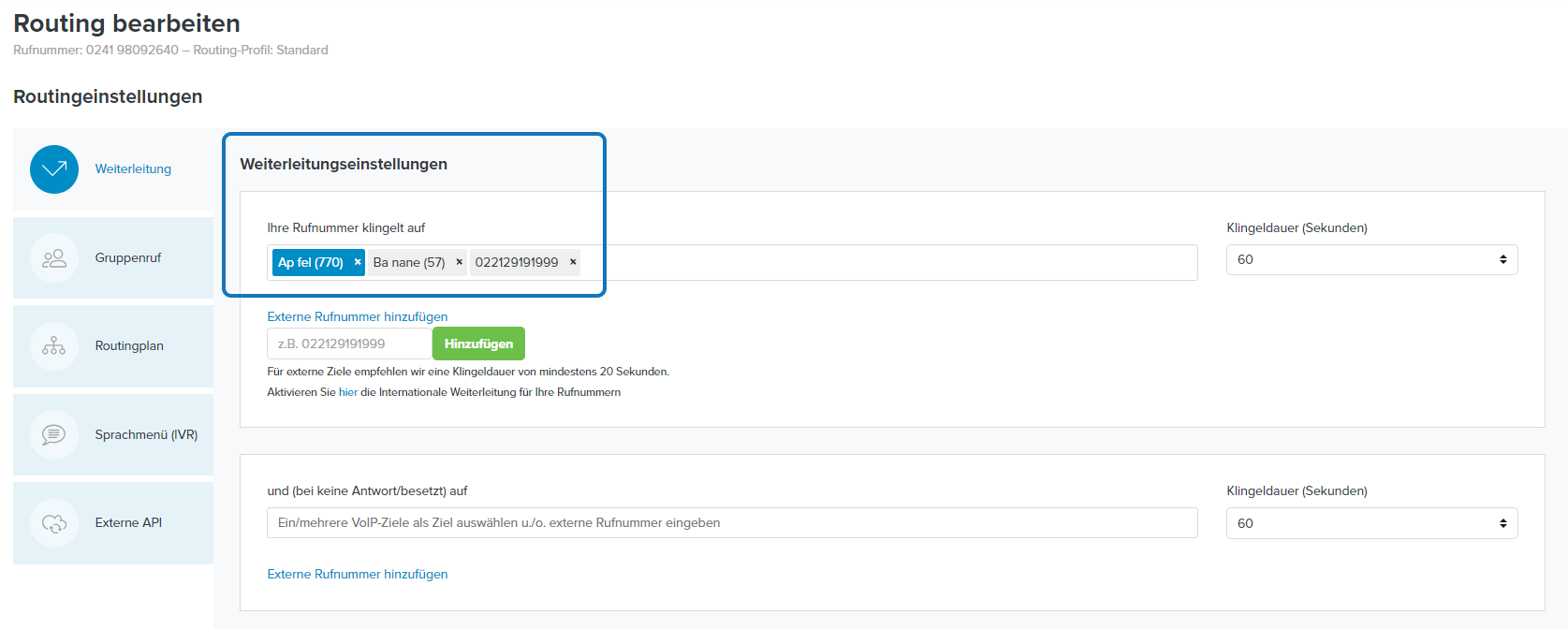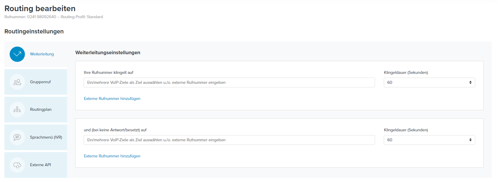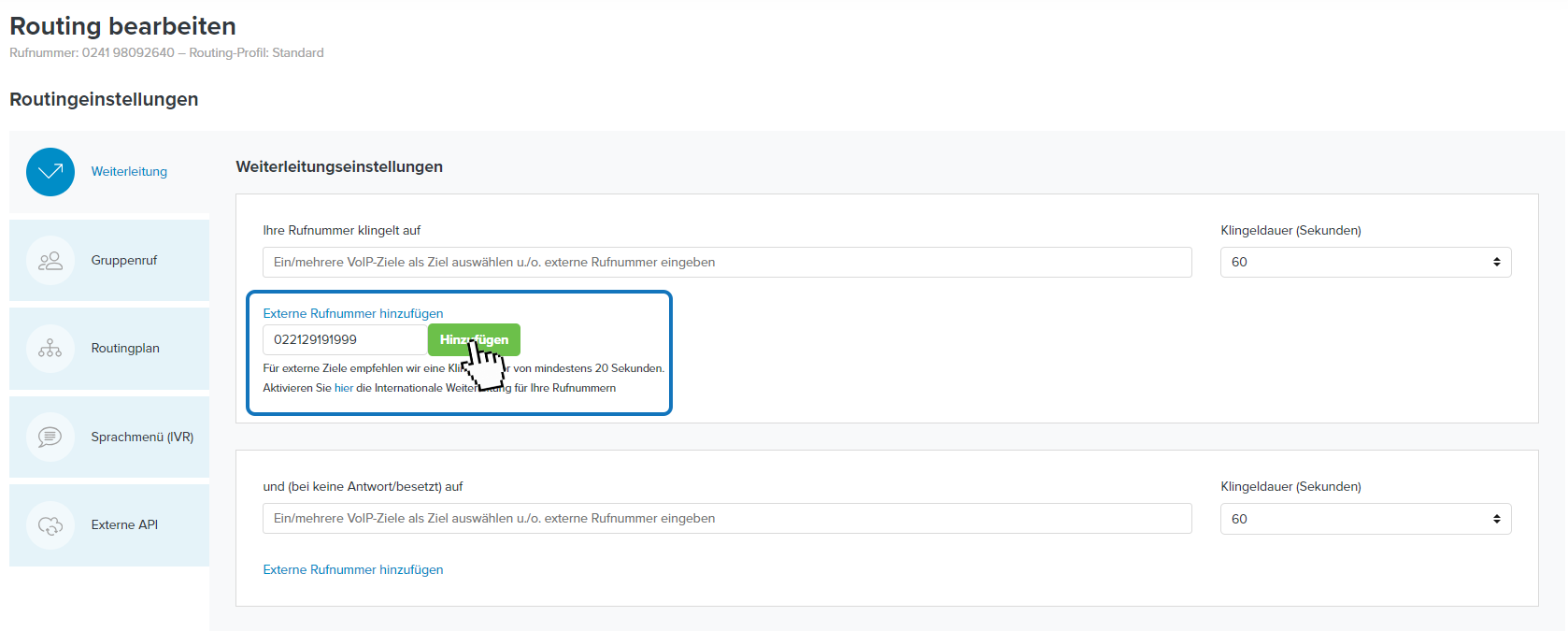 Klicken Sie auf die Schaltfläche Externe Rufnummer hinzufügen und tragen Sie die Festnetz- oder Mobilfunknummer ein, auf die Sie weiterleiten möchten.