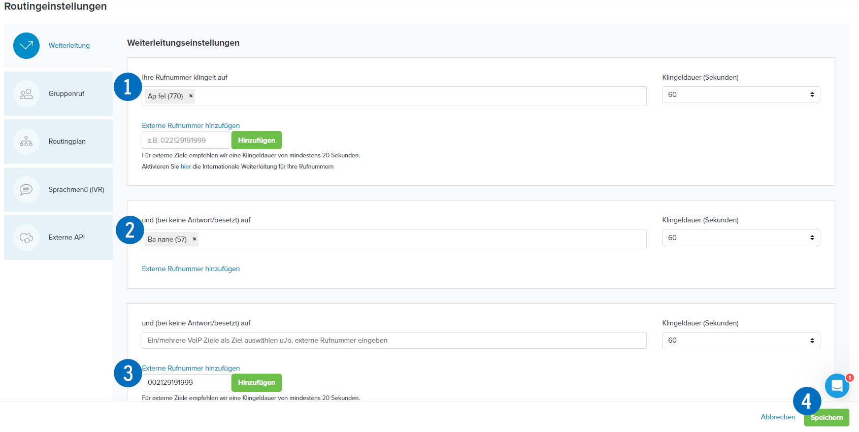 Bitte beachten Sie: Sie müssen eine korrekte, richtige Rufnummer im Format „0221123456“ eintragen. Nutzen Sie kein Format, das mit „00…“ oder „+…“ beginnt. Diese Gespräche werden dann nicht korrekt geroutet.