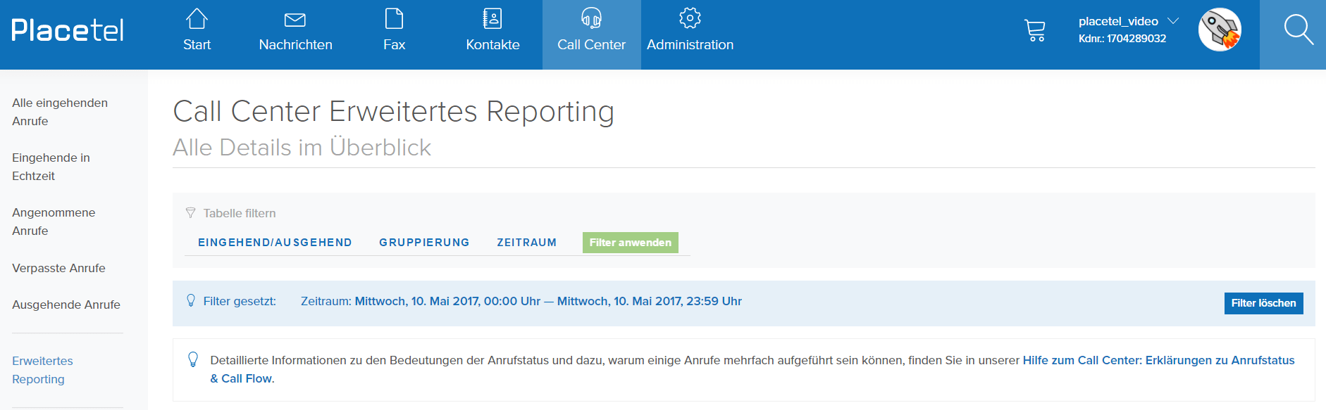 Im erweiterten Reporting können Sie viele weitere Auswertungen zu Ihren Call Center Aktivitäten sehen. Hier finden Sie unter anderem auch durchschnittliche, sowie gesamte Gesprächs- und Wartezeiten. Des Weiteren können Sie Ihre Reports auch in einer CSV-Datei herunterladen, um die Auswertungen noch einmal nachzubearbeiten.