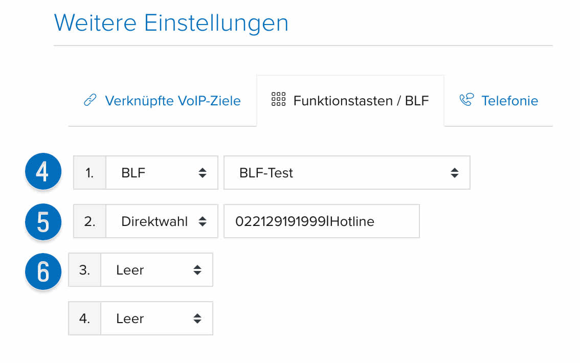 - Wechseln Sie zum Reiter Funktionstasten/BLF und bestimmen Sie dort, welches VoIP Ziel auf welcher Funktionstaste hinterlegt werden soll.