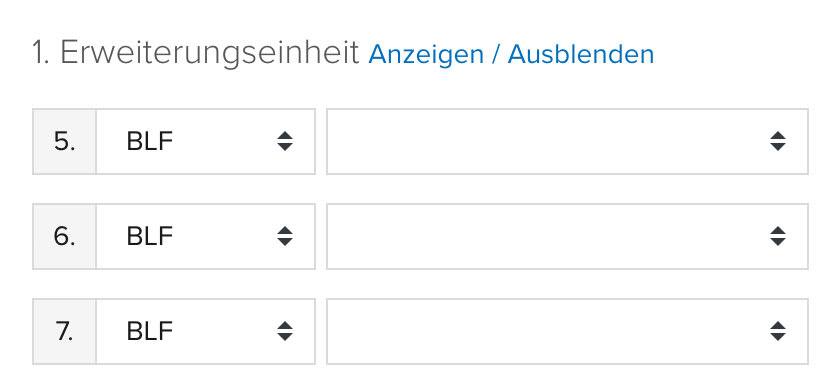 Für viele CISCO Telefone können Sie im Shop entsprechende Erweiterungsmodule erwerben, die Ihnen zusätzliche Funktionstasten bereitstellen. Diese können Sie ebenfalls im Kundenkonto provisionieren und belegen. Folgen Sie dazu ebenfalls den Schritten 1-6, beachten Sie aber, dass die zusätzlichen Tasten im Kundenkonto (Endgeräte > Funktionstasten/BLF > Erweiterungseinheit) unter den eingebauten Tasten eingestellt werden. Eventuell müssen Sie das entsprechende Menu erst aufklappen.