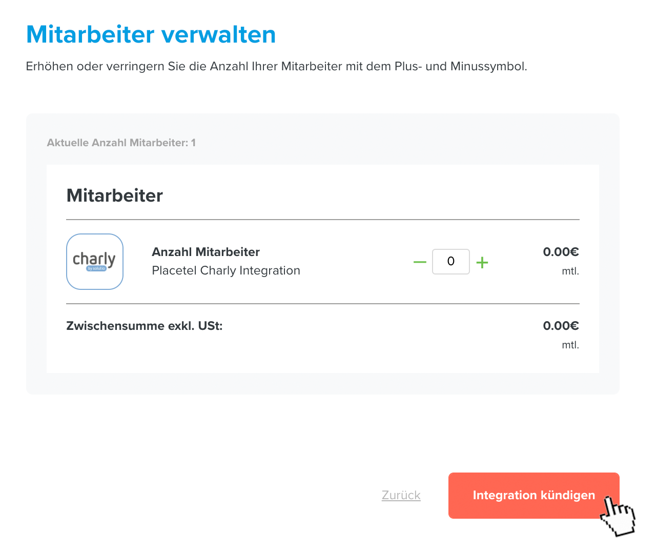 Placetel: Mitarbeiter verwalten - Senken Sie Sie die Anzahl der gewünschten Mitarbeiter auf Null.