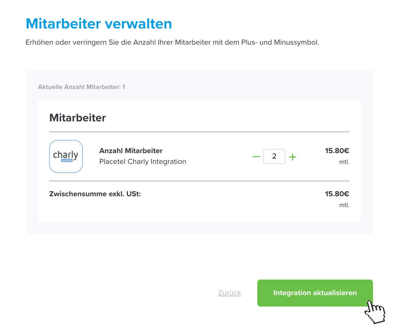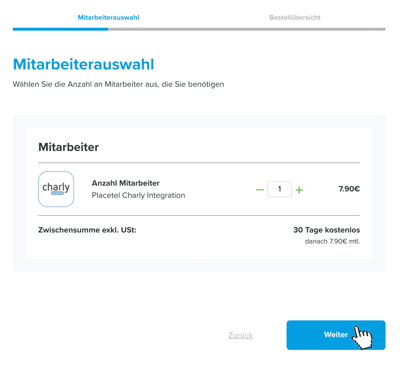 Placetel: charly auswählen - Placetel: Wählen Sie die Anzahl der Mitarbeiter, die Sie buchen möchten. Sie können die Anzahl später im Rahmen der Kündigungsfristen erhöhen oder senken.