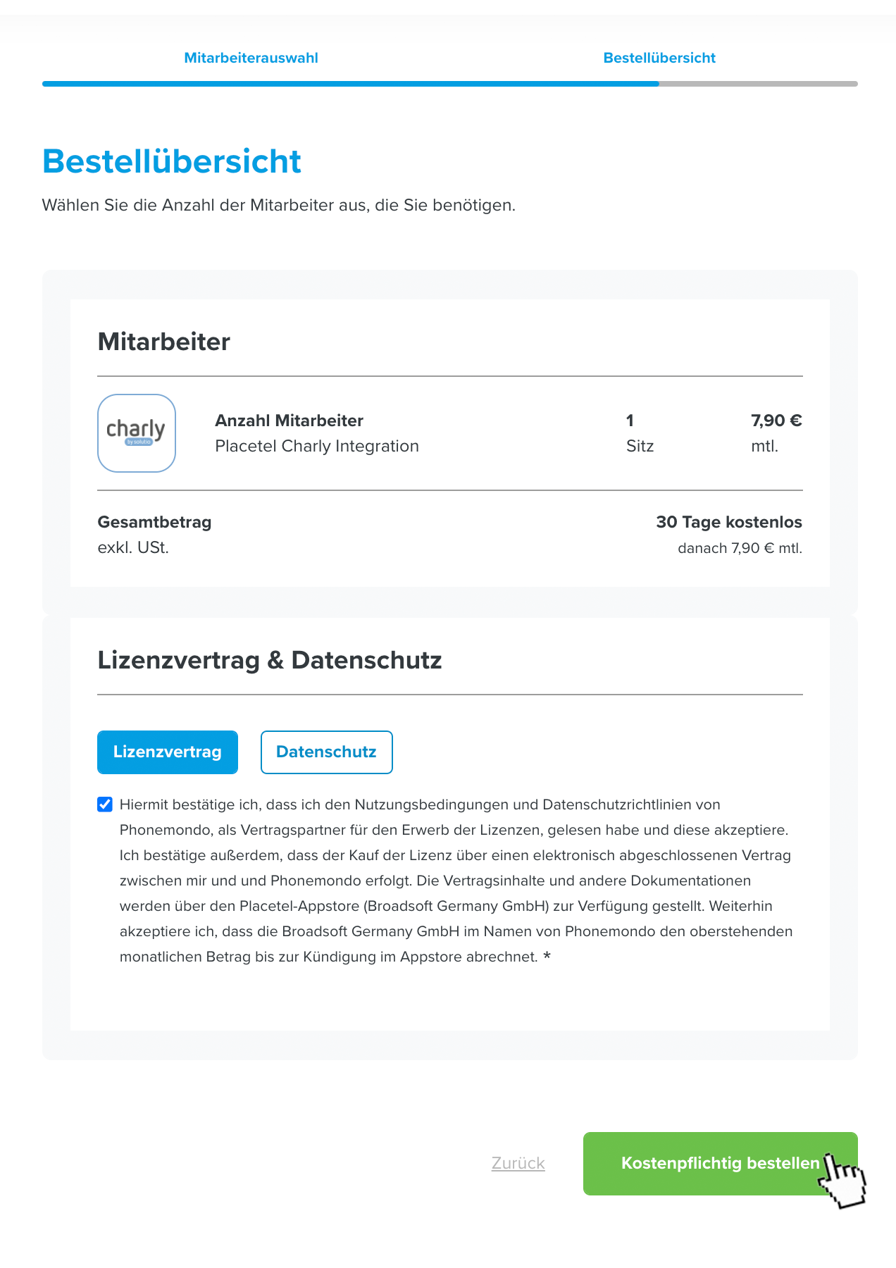 Placetel: charly buchen - Placetel: Akzeptieren Sie den Lizenzvertrag und klicken Sie auf kostenpflichtig bestellen.