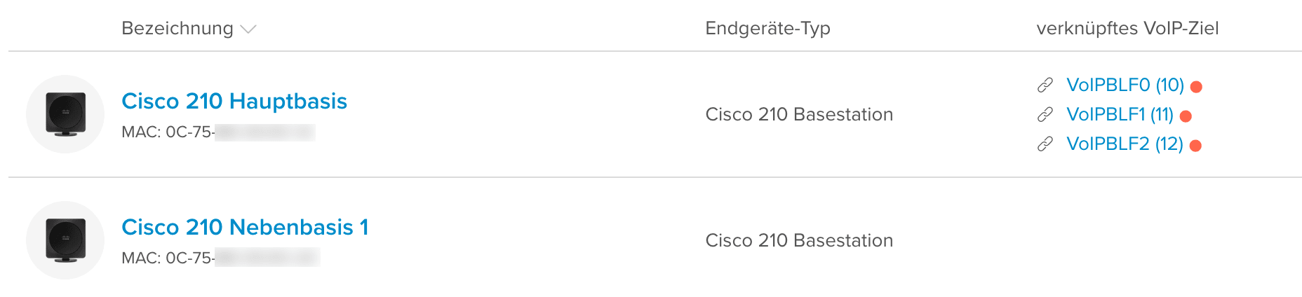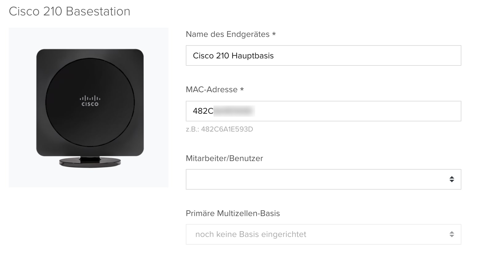 - Legen Sie jede weitere Basisstation als neues Endgerät unter Administration → Endgeräte an. Wählen Sie dazu Cisco → DECT 210 und geben Sie die MAC Adresse der Basis ein. Geben Sie der Basis einen eindeutigen Namen, so dass erkennbar ist, dass es sich um eine Nebenbasis handelt.